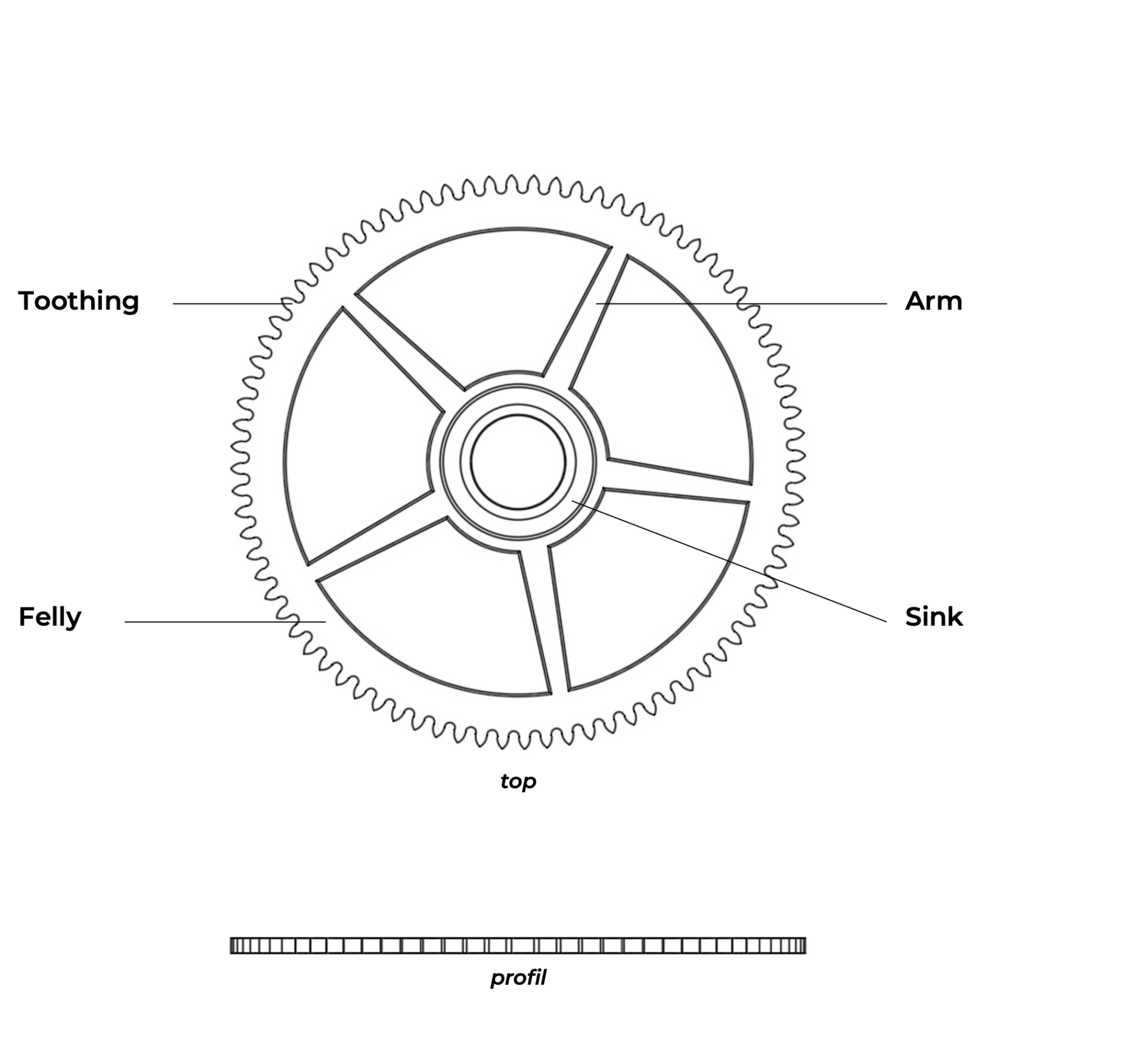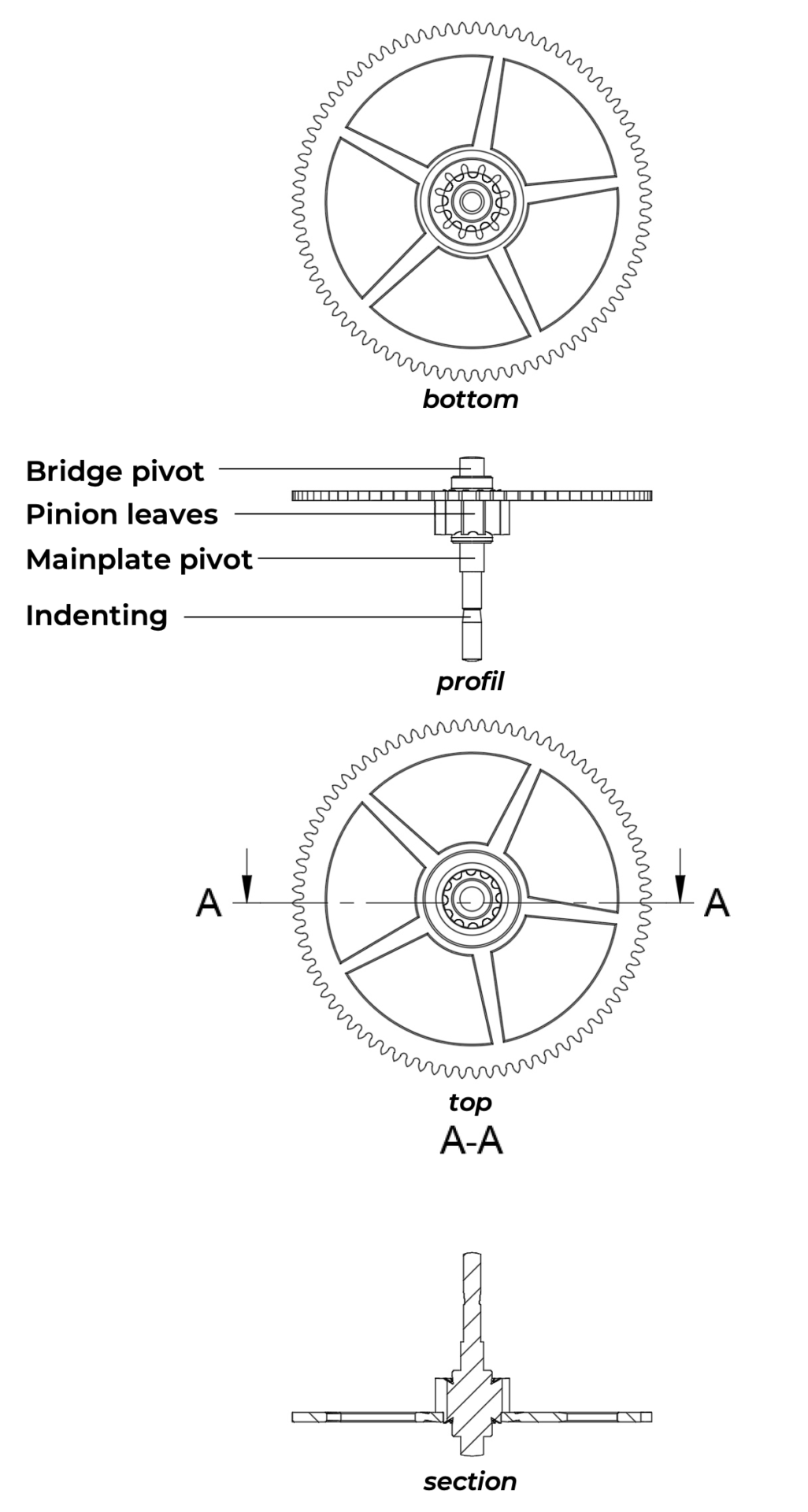 The combination of a brass wheel with a steel pinion is optimal for minimising friction in the gear trains of a movement. This principle applies to most multiplicative and reducing trains in a watch (gear train, setting train, etc.).