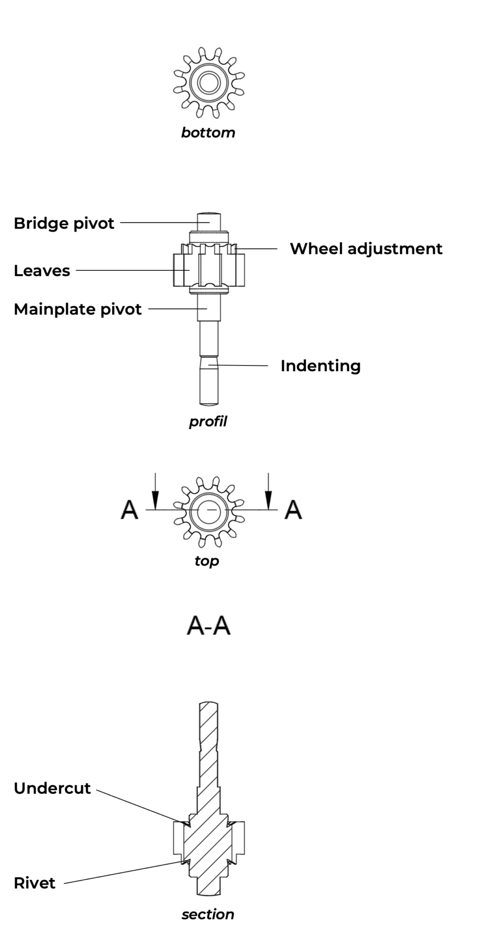 Traditionally, the centre wheel is made of gilded brass. The pinion is made of hardened, mirror-polished steel to improve its mechanical resistance. The pivots are burnished (surface work-hardened). They run in synthetic jewels (rubies) and are lubricated to reduce friction and wear.