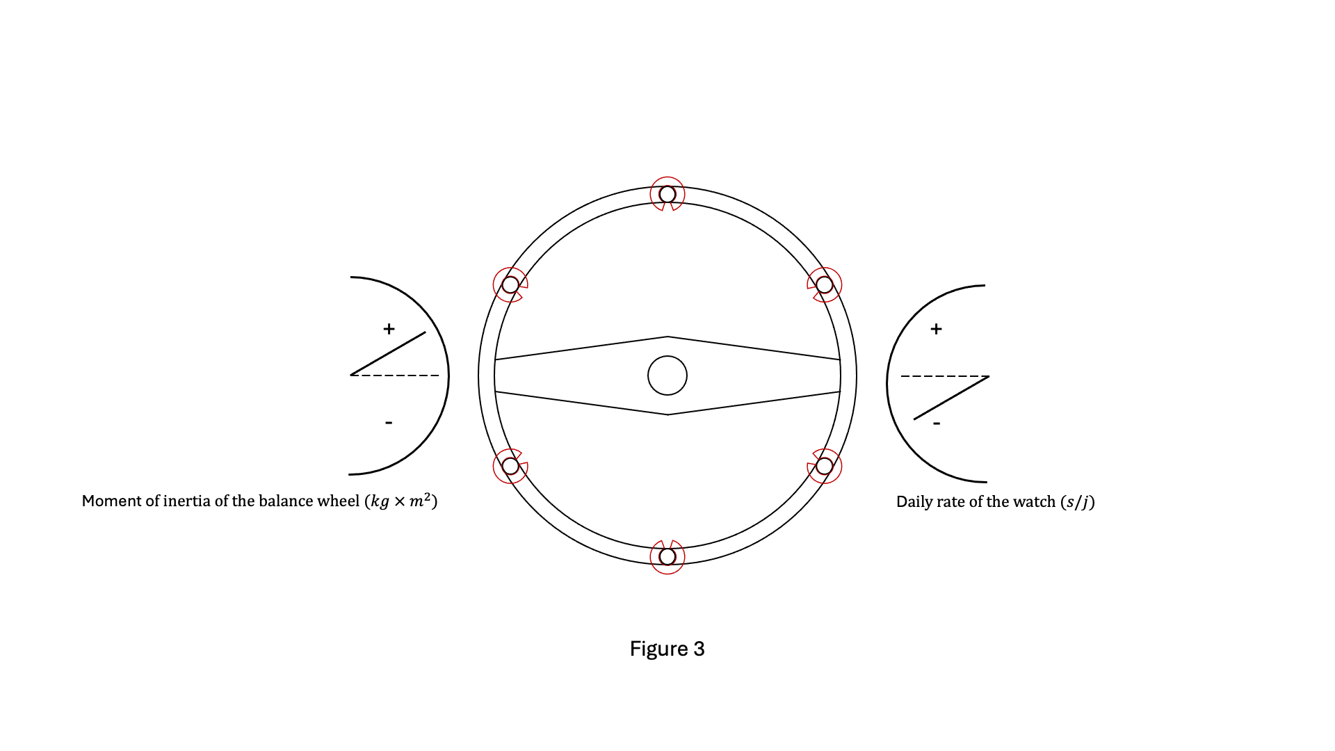Variable-inertia balance wheels take advantage of this physical law. Screws are placed around the periphery of the balance wheel, or split timing weights (generally made of gold) are fitted to the balance rim. By moving their mass toward the inside of the balance wheel, the moment of inertia decreases and the frequency (rotational speed) increases, causing the watch to gain time. Conversely, by moving the mass of the screws or timing weights toward the outside of the balance wheel, the moment of inertia increases and the frequency decreases, causing the watch to lose time (Figure 2).