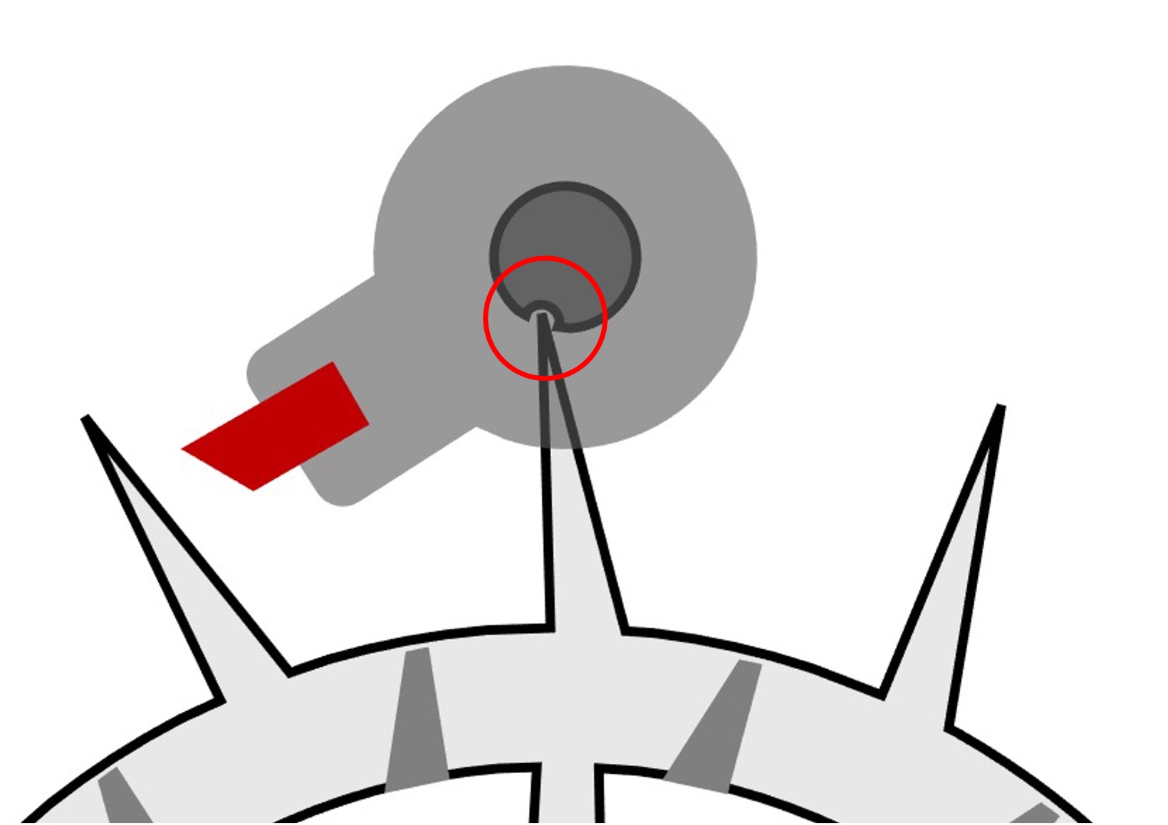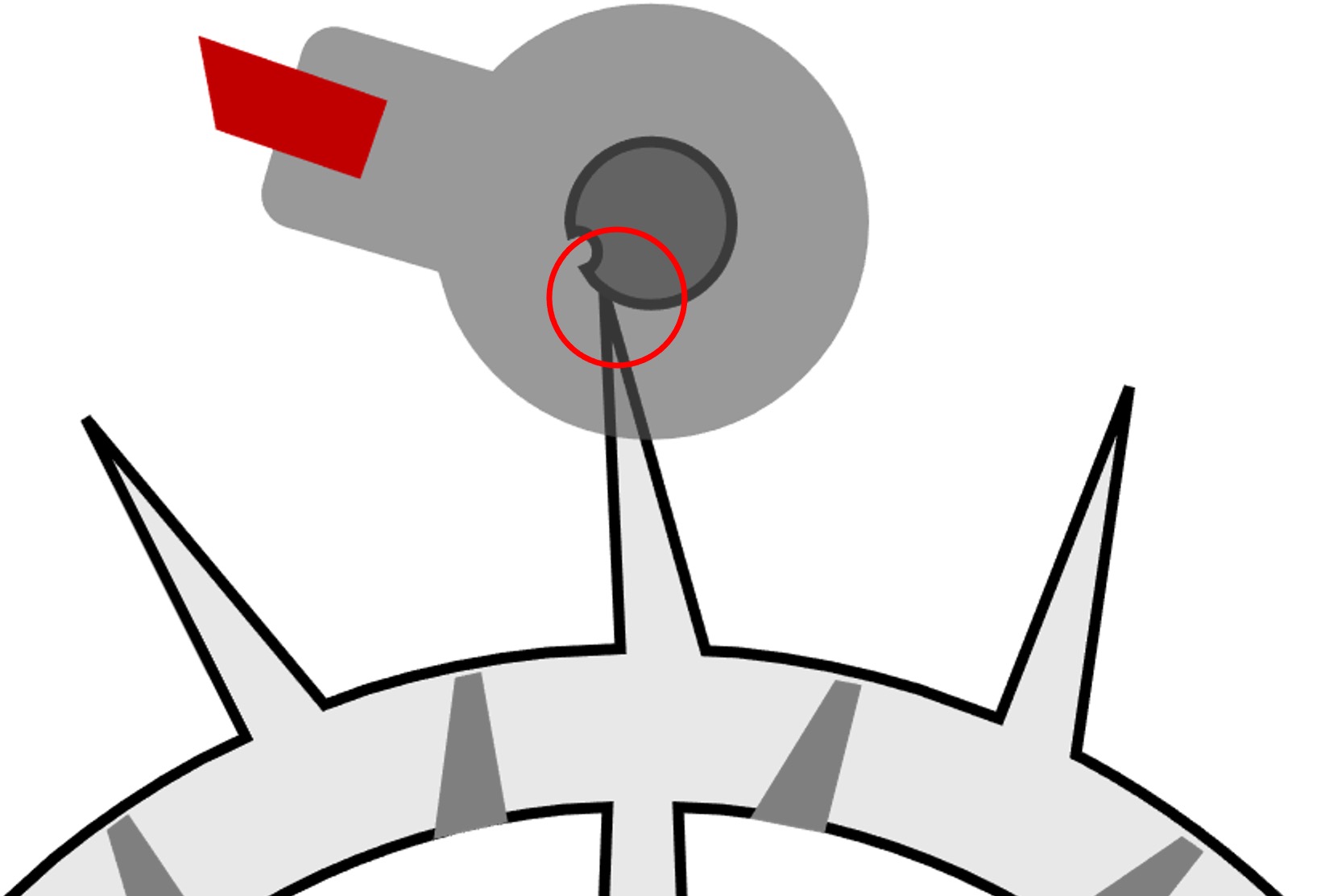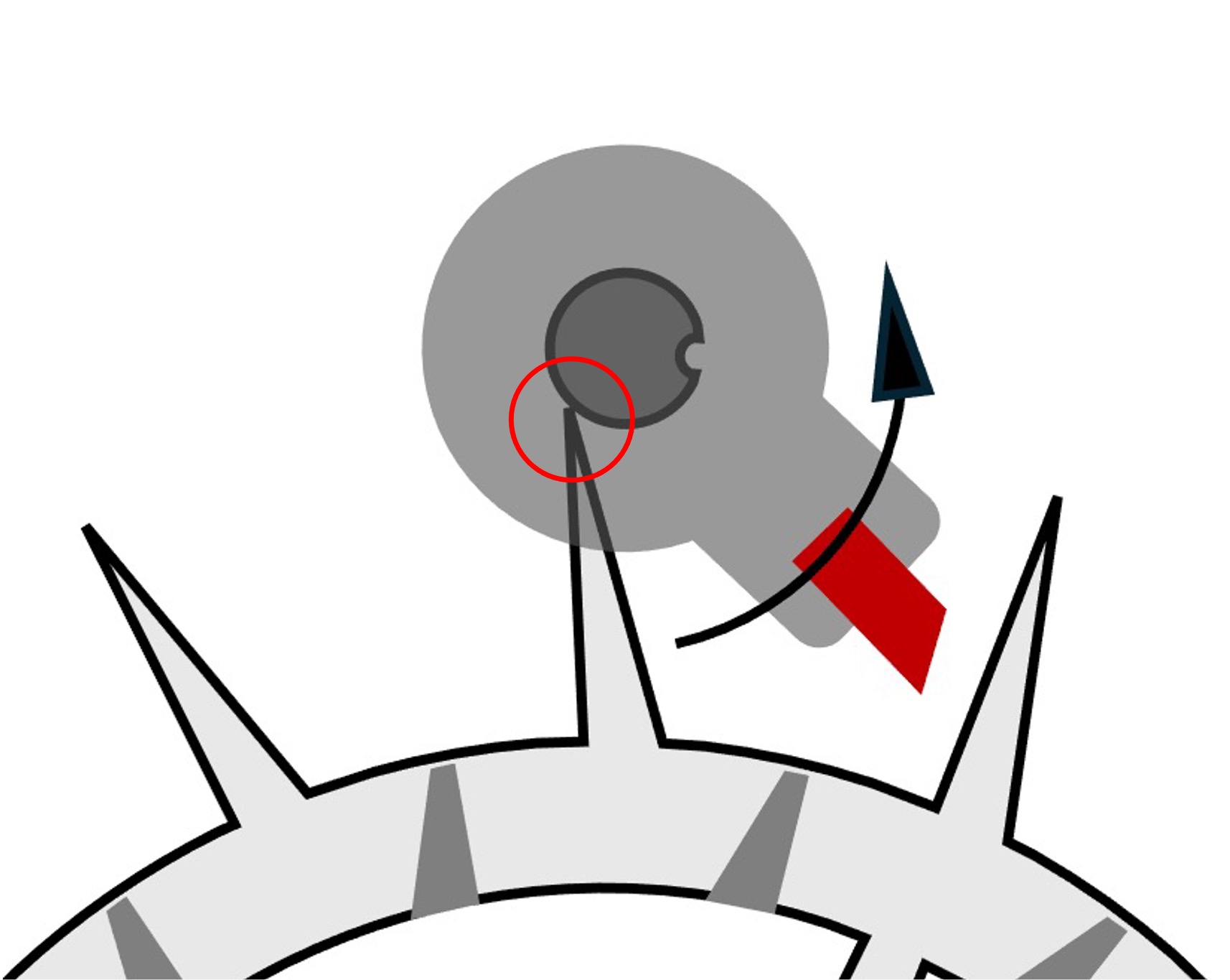 The escape wheel catches up with the impulse roller. An impulse tooth of the escape wheel comes into contact with the impulse pin carried by the table (Figure 4).