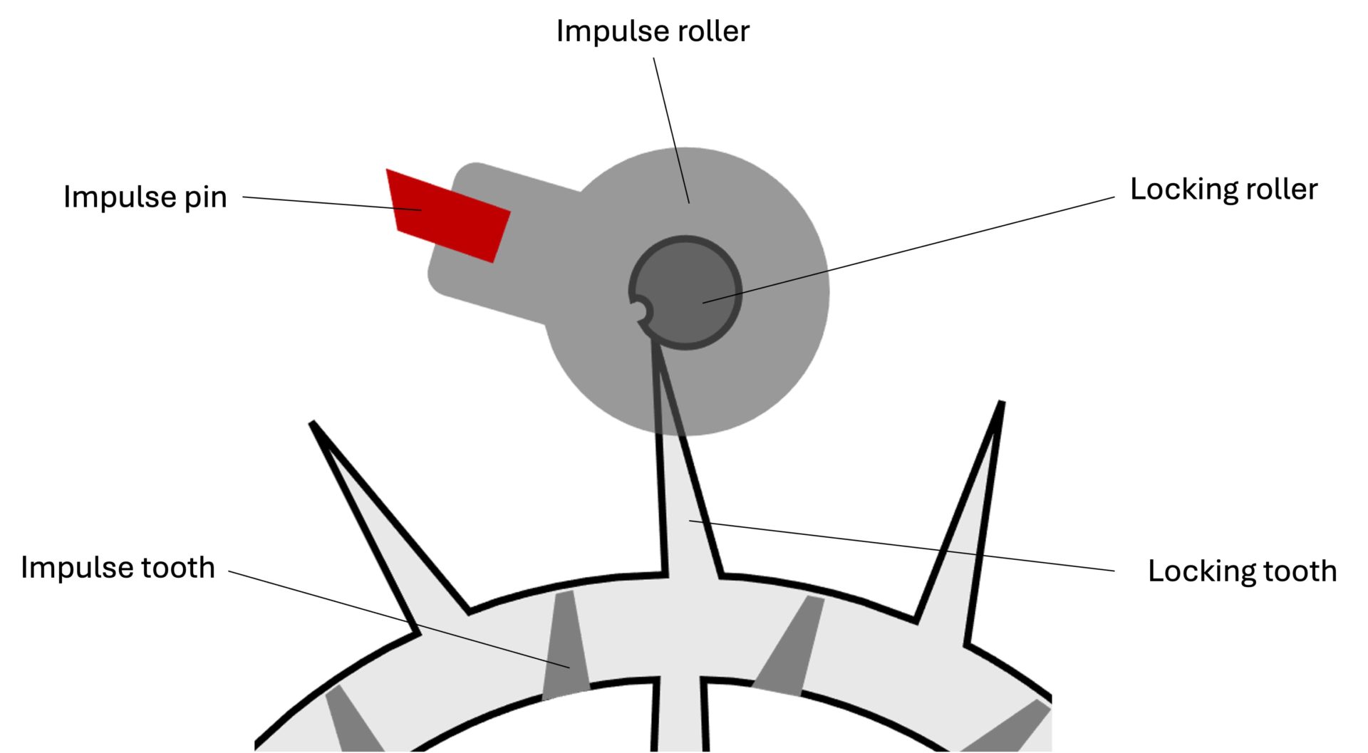 While the balance wheel performs its supplementary arc, a locking tooth rests against the locking roller (Figure 2).