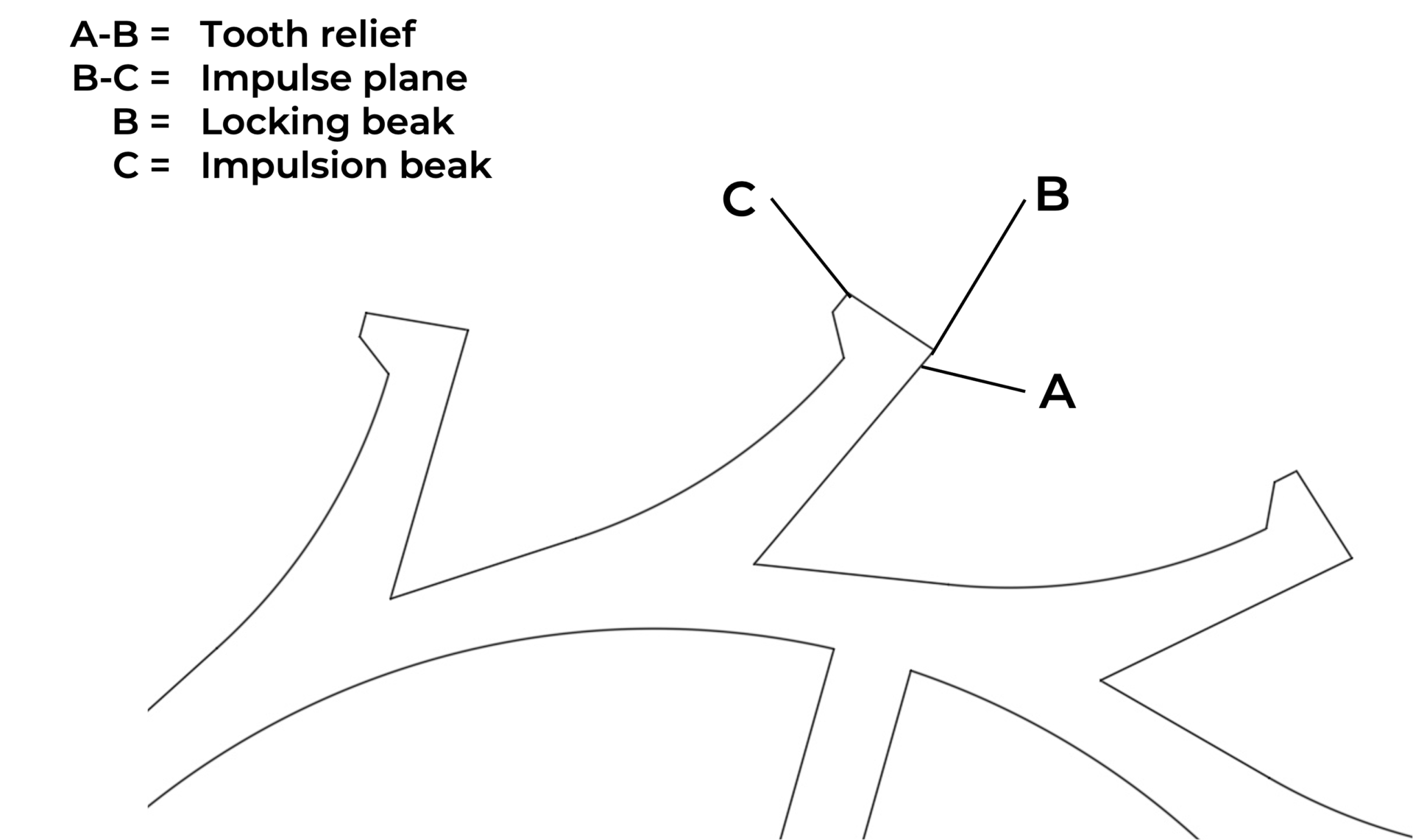 The distinctive toothing of the escape wheel is designed for its special interaction with the lever and its pallets. The lever, the escape wheel, and the double roller together constitute the escapement, which serves a dual purpose: to stop the movement when the balance wheel freely oscillates and to transmit regular impulses to the regulating organ by transforming the rotational movement of the gear train into an oscillatory movement of the regulating organ.