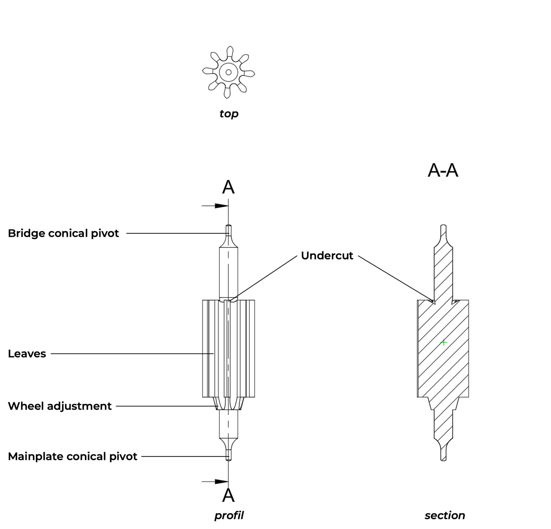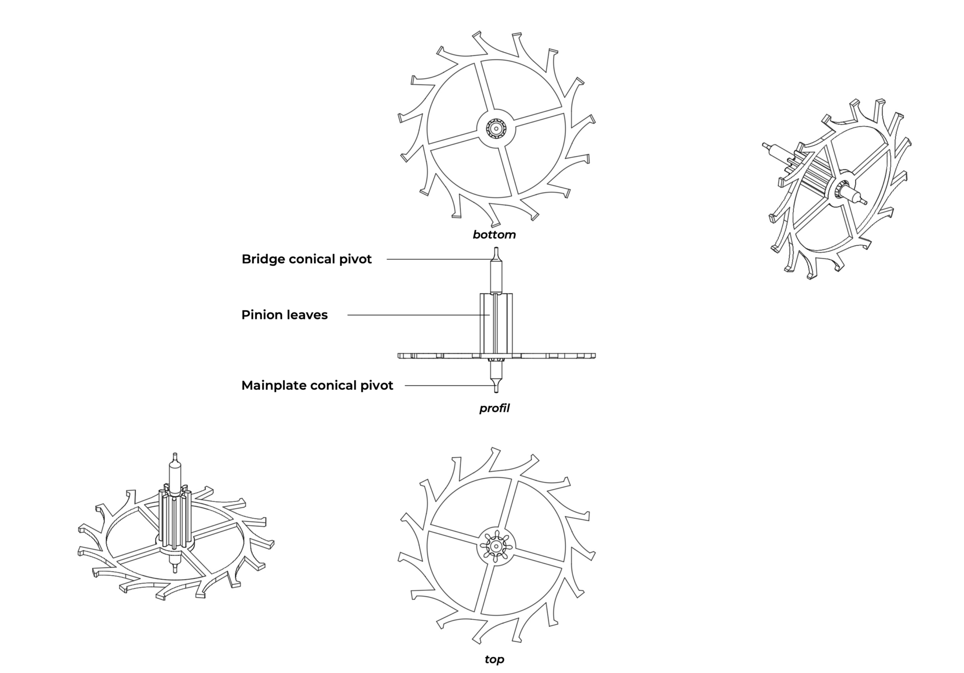 The pinion is similar to those of other wheels. It is driven by the third wheel and belongs to the counting and transmission organ (gear train).