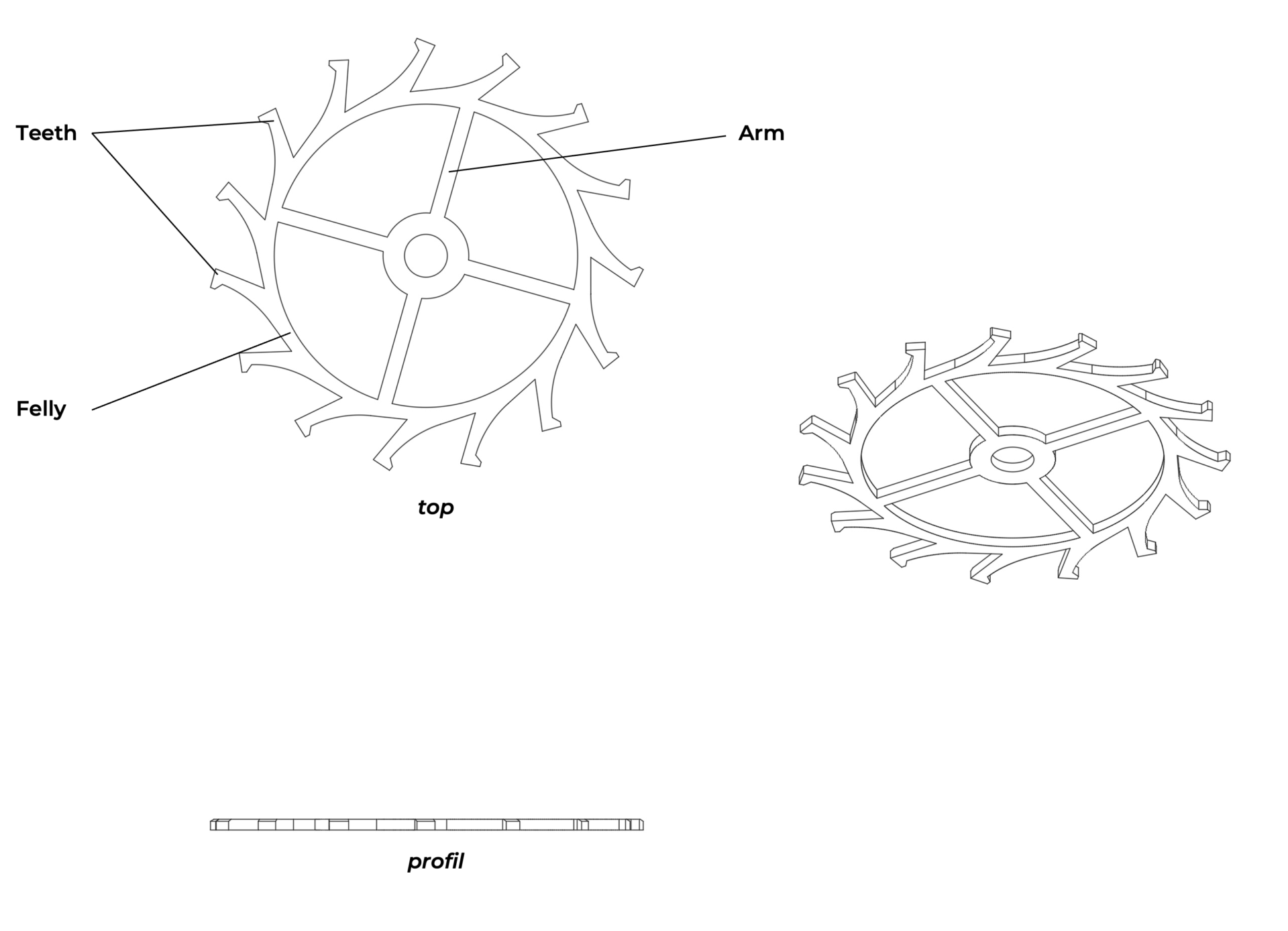 Because of their small size and the rigidity of their material, escape wheels typically have only four arms (compared with five arms for the wheels of the gear train). This reduces weight, lightness being a crucial quality for the escape wheel in particular.
