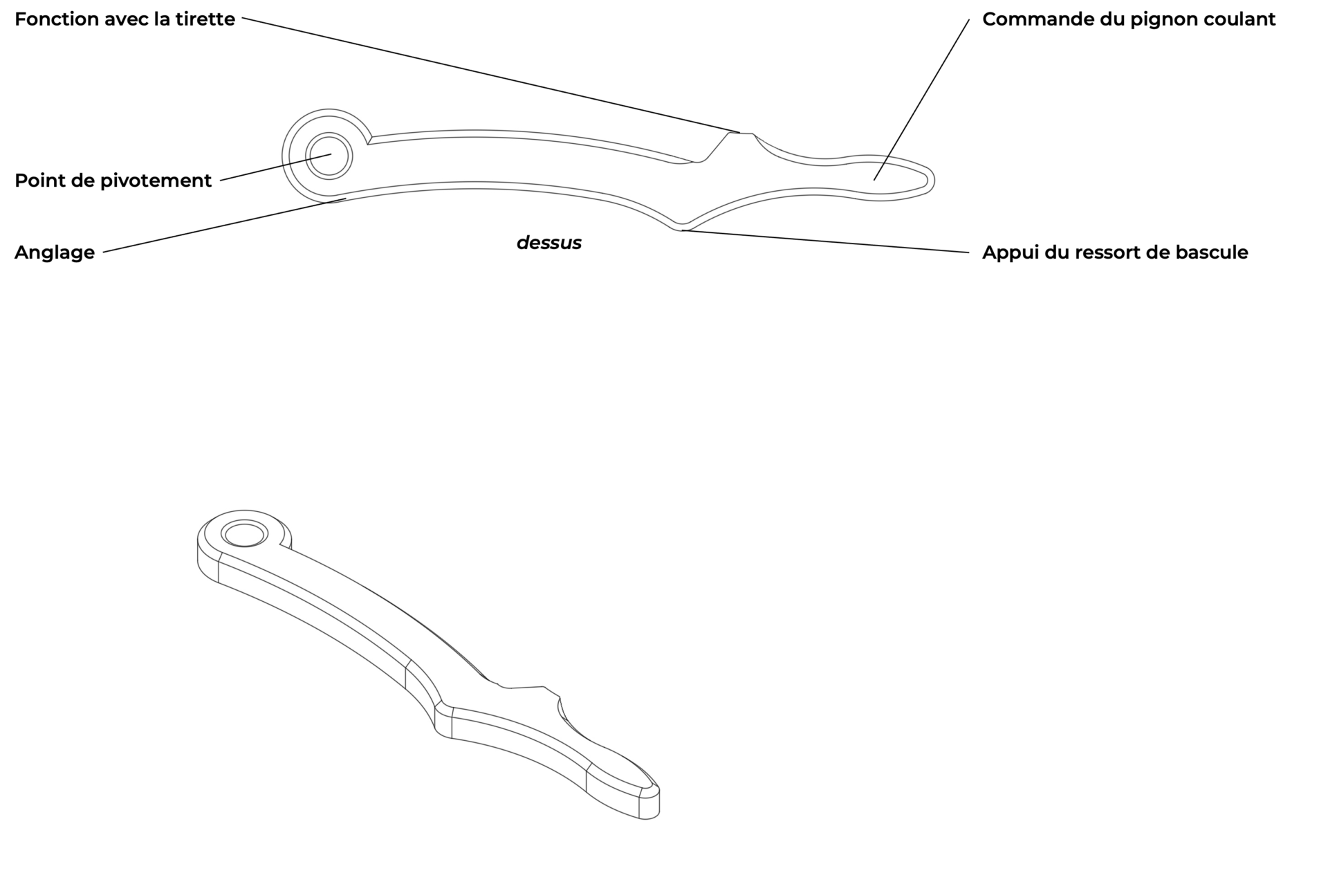 La bascule appartient conjointement aux mécanisme de remontoir et de mise à l’heure. C’est l’élément qui permet de commuter la commande de la tige de remontoir entre ces deux mécanismes. Il s’agit d’un levier pivotant sur un tenon chassé dans la platine à son extrémité. L’autre extrémité de la bascule est logée dans la gorge du pignon coulant. Lorsqu’elle est actionnée elle contraint le pignon coulant à coulisser sur la tige de remontoir pour passer d’une fonction (remontoir) à l’autre (mise à l’heure) et inversement.