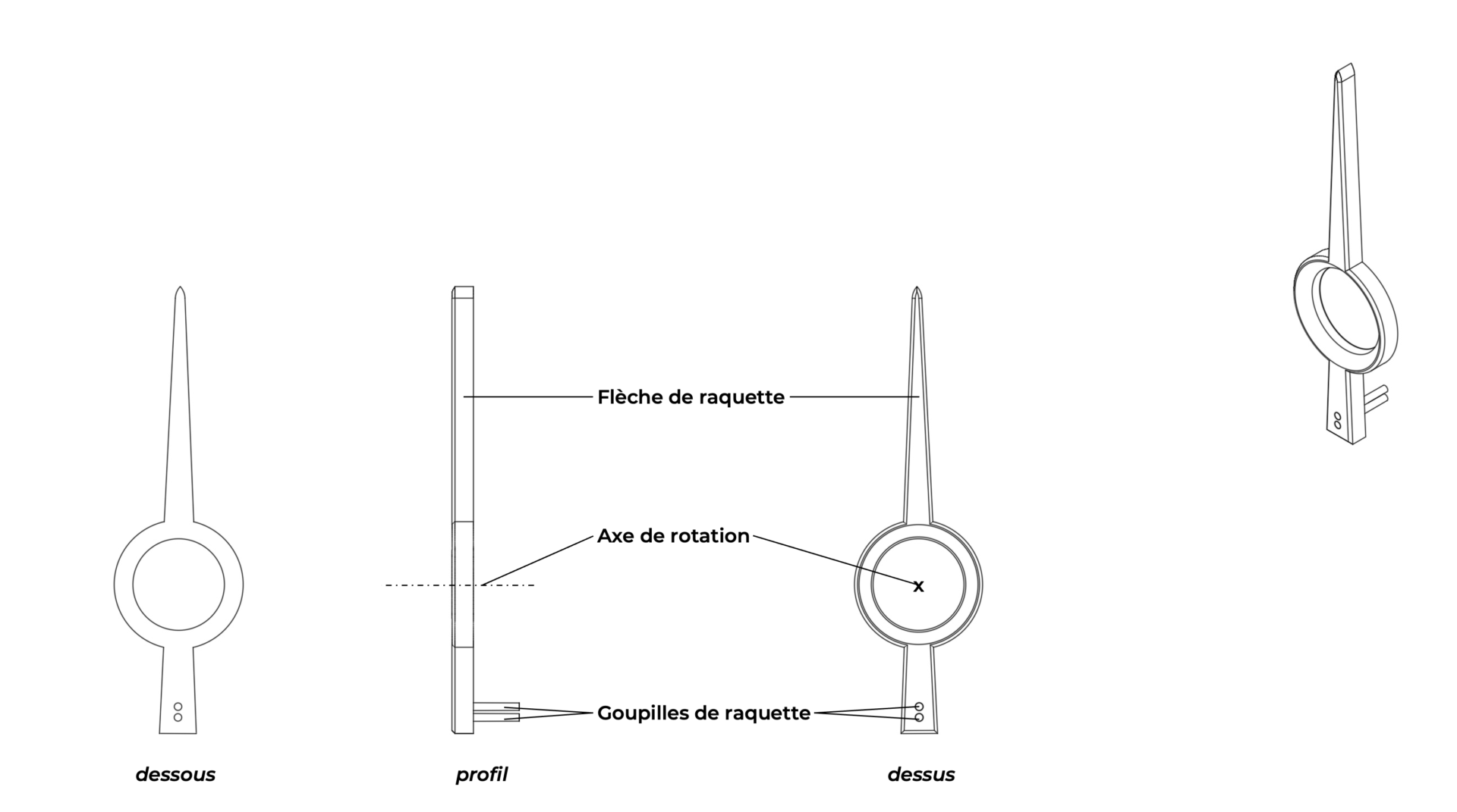 L’horloger commence la fabrication artisanale de la raquette en pointant et perçant le centre de son axe de rotation à la surface d’une plaque d’acier d’une épaisseur légèrement supérieure à celle du composant terminé. Il grave ensuite le contour du profil de la raquette à l’aide d’une pointe à tracer en se centrant sur le point de pivotement. Puis il découpe délicatement le contour de la raquette à l’aide d’un bocfil. Les flancs de la pièce sont ensuite limés pour amener la raquette à son épaisseur finale et dans le respect absolu de sa forme. La raquette est ensuite anglée et polie à l’aide des outils usuels (limes, cabrons, polissage). Une grande moulure est généralement polie en son centre. Selon les règles de l’art, l’artisan étire ensuite les traits des flancs de la pièce (satinage) et de l’infime plat qui reste sur la surface supérieure de la raquette. De ce fait, il calibre également l’épaisseur de la raquette afin de réguler sa friction avec le noyau de raquette. Cette friction doit être suffisamment légère pour permettre de modifier précisément la position de la raquette et suffisamment forte pour éviter tout déréglage intempestif, lors de chocs notamment.