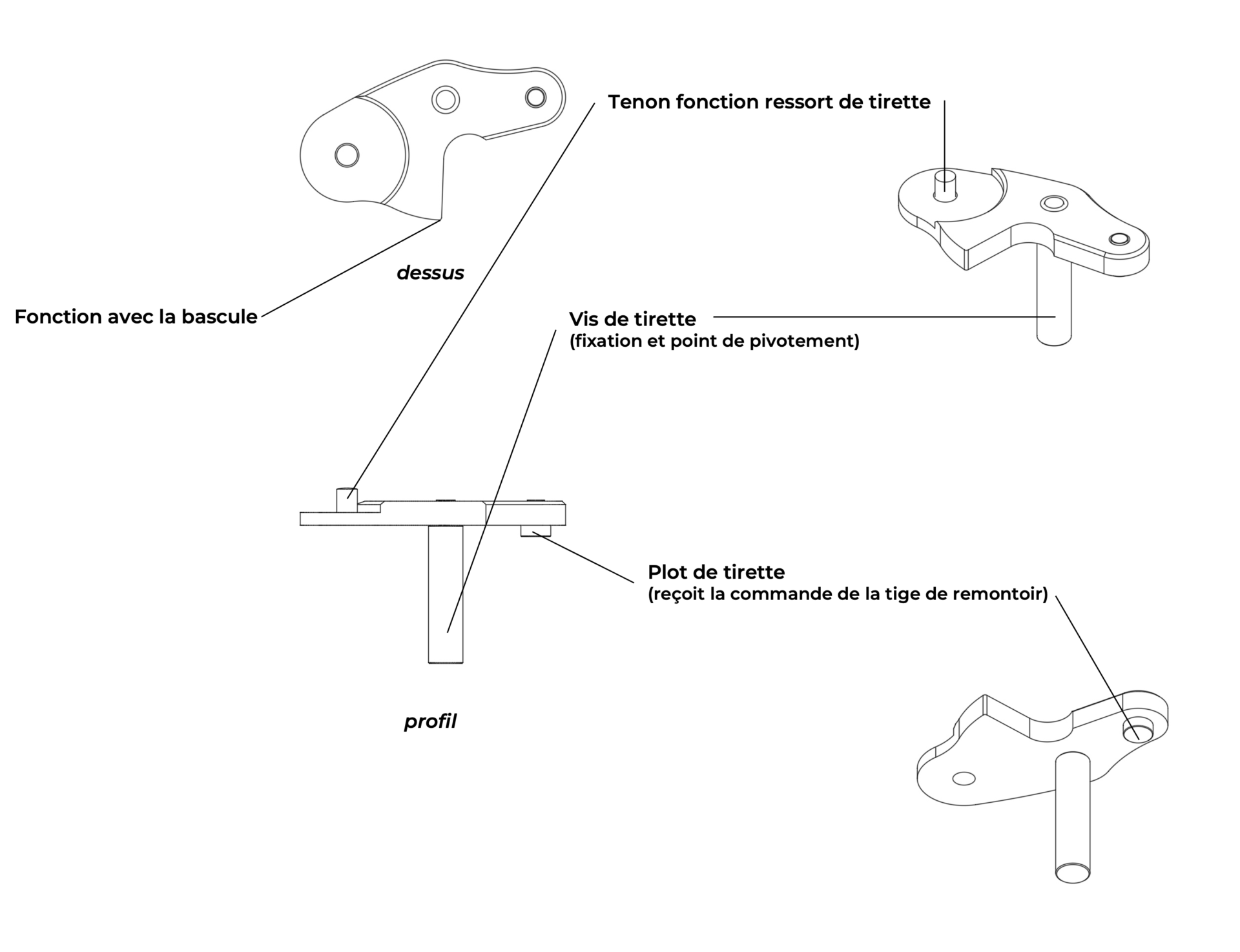 Lorsque la tirette est proche de ses cotes finales, l’horloger ajuste la fonction qui lie la tirette à la bascule en préassemblant les deux composants à la platine. Plus que la cote d’un plan c’est typiquement une action pour laquelle l’œil et la main de l’artisan demeurent les meilleurs outils. Le plot de tirette peut ensuite être chassé. Les traitements thermiques et les opérations de blanchissage s’ensuivent et la tirette est dès lors prête à être assemblée.