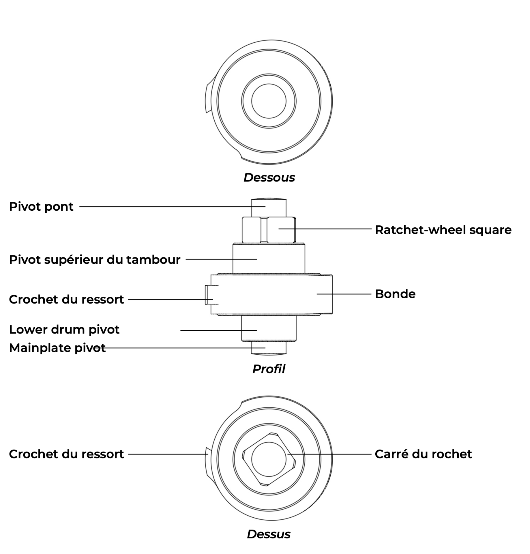 Au centre du plan vertical de l’arbre se trouve son plus grand diamètre : La bonde. A la circonférence de la bonde se trouve le crochet auquel vient fixée l’extrémité intérieure du ressort de barillet. La hauteur de la bonde correspond à la hauteur du ressort de barillet augmentée d’une légère sécurité permettant au ressort de se développer librement. De part et d’autre de la bonde se trouvent deux tigerons qui permettent au tambour de barillet de pivoter librement autour de l’arbre de barillet alors que celui-ci demeure fixe, bloqué par le cliquet d’armage. La partie inférieure de l’arbre de barillet se termine par le pivot qui le liera à la platine. Le rochet peut être placé en-dessous (selon notre exemple) ou en-dessus du pont de barillet. Le carré de l’arbre de barillet qui permet de recevoir le rochet émerge directement de la partie supérieure du tambour puis se termine par son pivot supérieur lié au pont de barillet quand le rochet se trouve en dessous du pont de barillet. Si le rochet se trouve au-dessus du pont de barillet, les positions du carré et du pivot supérieur de l’arbre seront inversées. Dans un tel cas, la partie supérieure de l’arbre de barillet est percée et taraudée le rochet venant s’y ajuster sur son carré avant d’y être vissé.