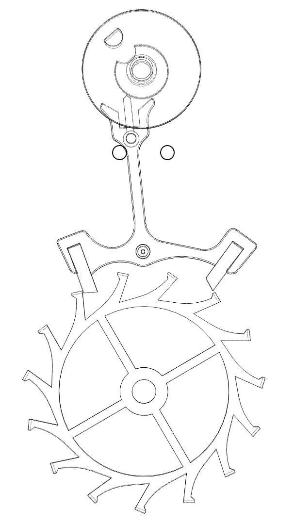 - Sécurité de fonctionnement : La circonférence du petit plateau offre une butée au dard lorsque le balancier effectue son arc supplémentaire ascendant et descendant empêchant ainsi l’ancre de sauter malencontreusement d’une goupille de limitation à l’autre sous l’effet d’un choc (renversement).