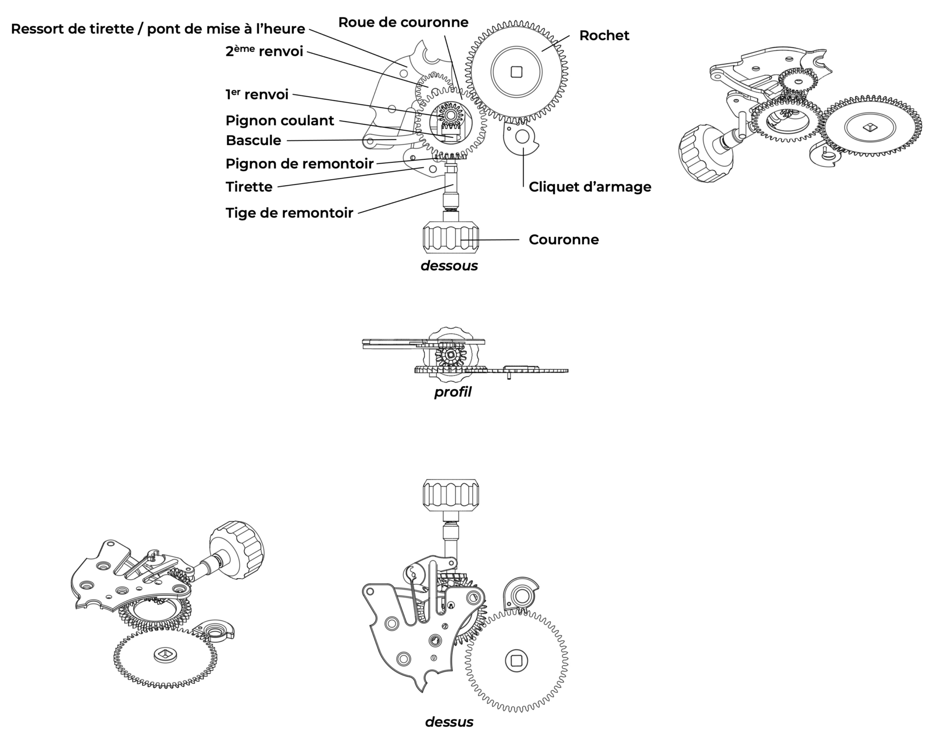 Comme l’indique son nom, le mécanisme de remontoir et de mise à l’heure  permet à l’utilisateur de la montre de procéder à son remontage et à sa mise en l’heure en basculant mécaniquement d’une fonction à l’autre. Bien que nous le considérions comme un organe unique du mouvement et que de nombreux composants soient communs aux deux fonctions (remontage et mise à l’heure), nous détaillerons les deux fonctions individuellement pour une meilleure compréhension.