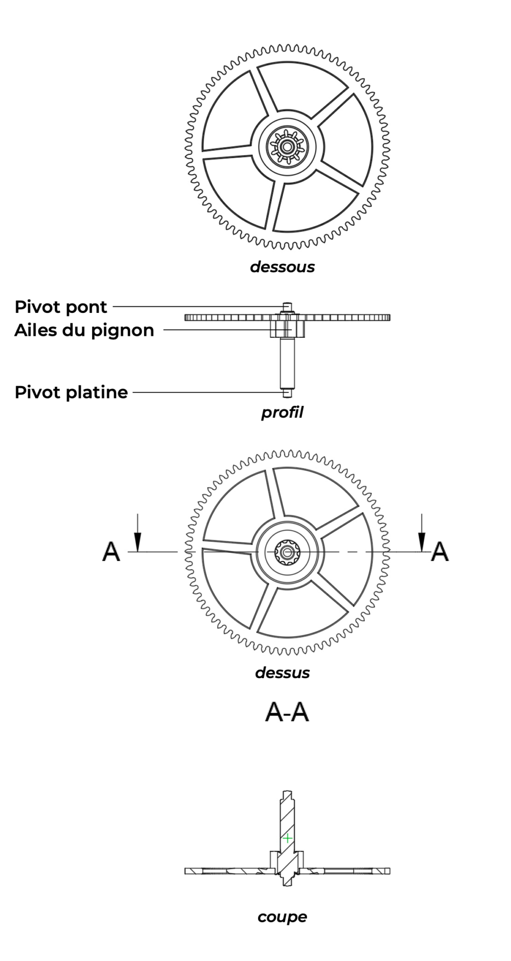 Comme les autres mobiles du rouage de finissage, le mobile de moyenne est constitué de deux composants :