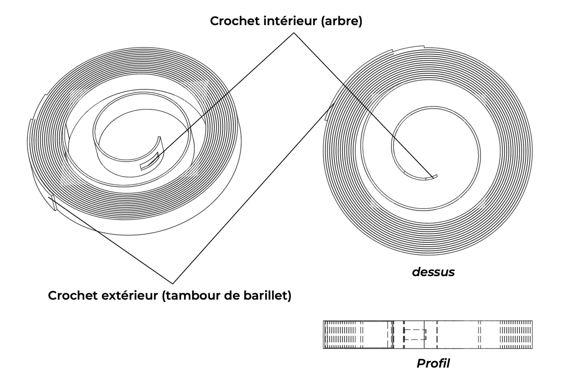 L’extrémité intérieure du ressort de barillet comporte une ouverture rectangulaire qui permet de fixer le ressort au crochet de l’arbre de barillet. A l’extrémité extérieure de la lame, une section de ressort, à la courbure inversée est soudée à la dernière spire. Cette section soudée est appelée la bride. Elle permet d’accrocher l’extrémité extérieure du ressort au fraisage réalisé dans la paroi intérieure du tambour.