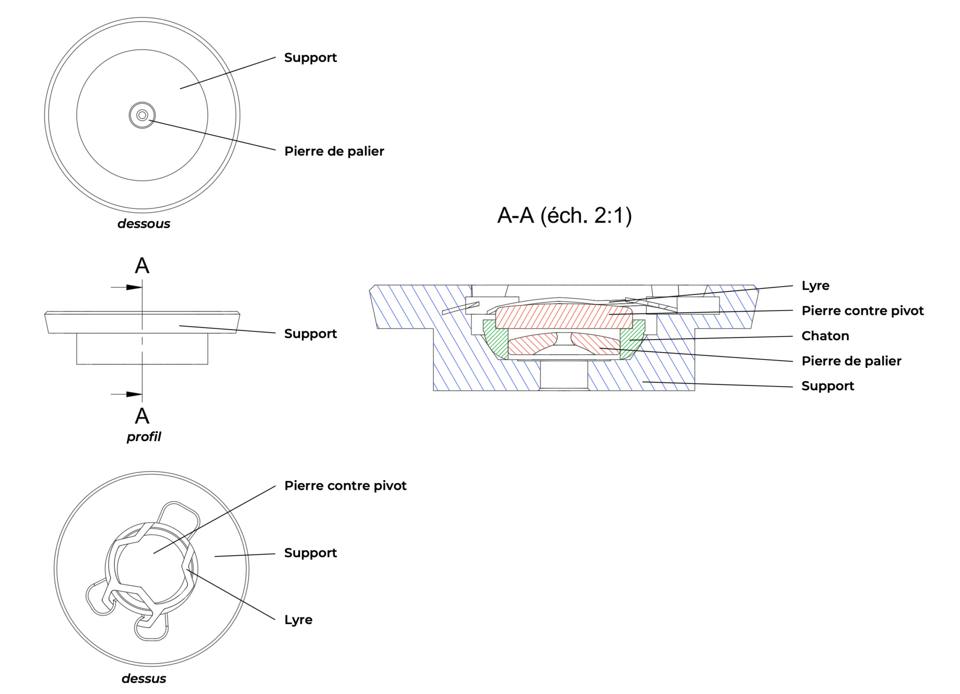La pierre de palier est solidement chassée dans la partie inférieure du chaton. Elle est percée pour permettre le passage du pivot. La pierre contre-pivot (plate et non percée) est posée dans la partie supérieure du chaton (amovible). La pierre contre-pivot est libre, son diamètre étant légèrement inférieur à celui-de son logement dans le chaton. En cas de choc, ceci permet à la pierre contre-pivot d’absorber le choc en se déplaçant verticalement, dans l’axe du pivot et simultanément de s’incliner à 360° autour ce même axe. Le chaton est lui-même logé (ajustement libre) dans le support d’antichoc, lequel est chassé dans le pont ou la platine. Enfin, le chaton est maintenu en appui au fond du support par les lames d’un ressort amovible : la lyre. C’est la lyre qui absorbe les chocs en permettant au chaton de bouger latéralement et verticalement dans le support et à la pierre contre-pivot de se déplacer verticalement par rapport au chaton.