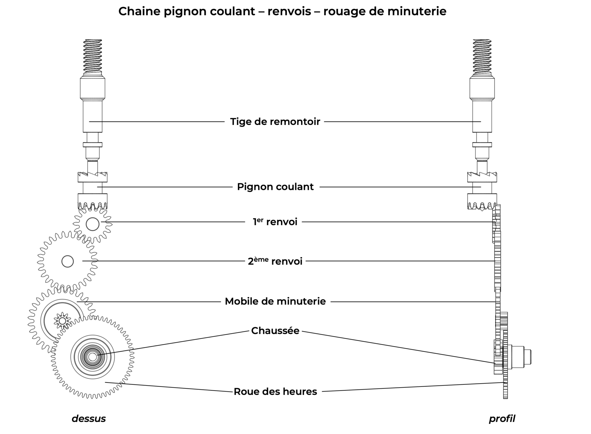 Un renvoi est un simple pignon dont le but est de transmettre l’énergie de la couronne (et donc de la tige de remontoir) au rouage de minuterie quand la couronne est tirée et en rotation (mise à l’heure). Le mécanisme de mise à l’heure peut comporter un ou plusieurs renvois. Le renvoi est généralement en acier et sa denture occupe toute sa hauteur. Le renvoi est percé au centre de son axe et pivote sur un tenon chassé dans la platine. Lorsque la tige de remontoir est tirée, le pignon coulant coulisse jusqu’à l’extrémité de la tige de remontoir et il engrène dès lors avec le premier renvoi. Un deuxième renvoi lui succède souvent et entraine alors directement la planche de la roue de minuterie.