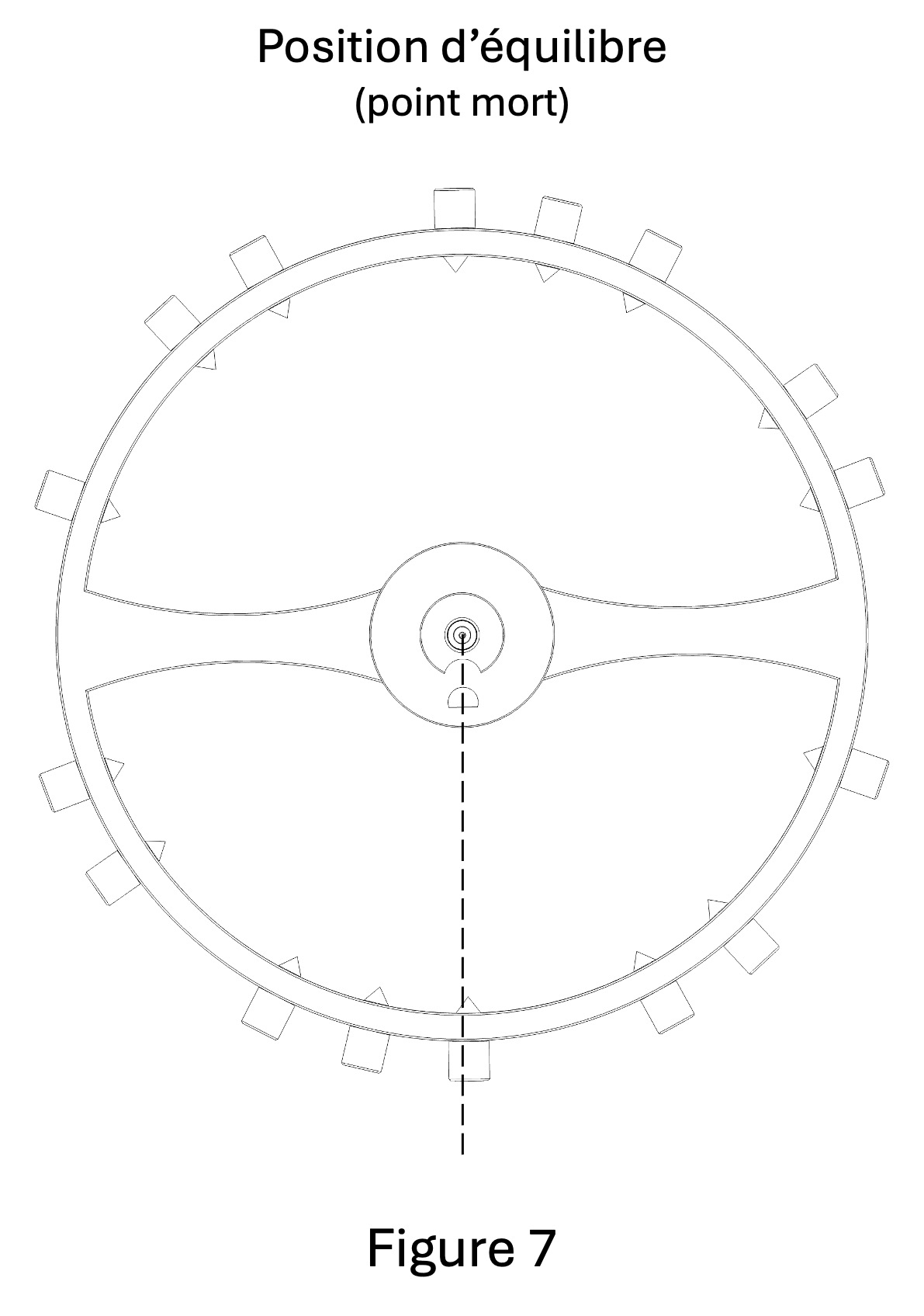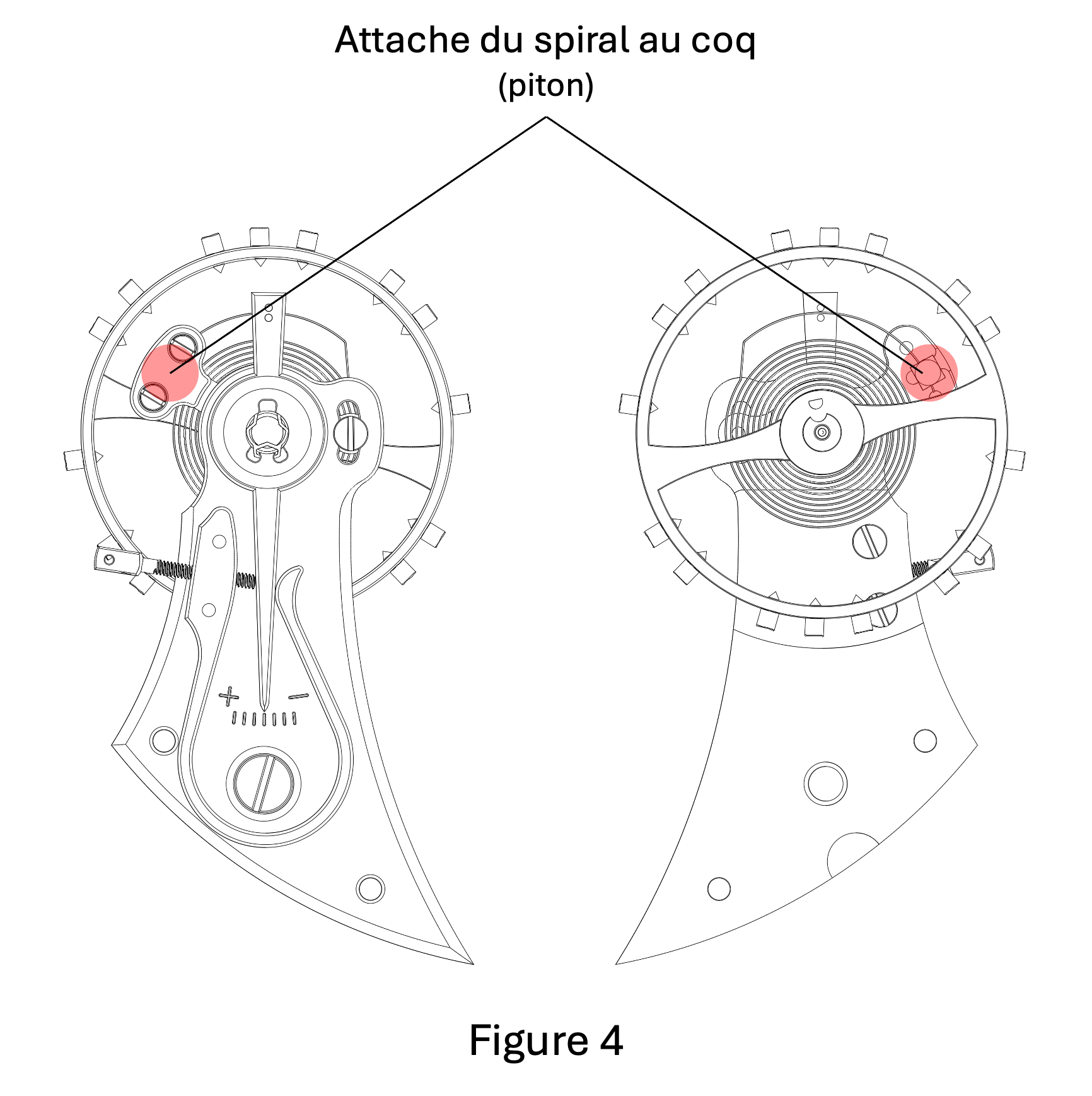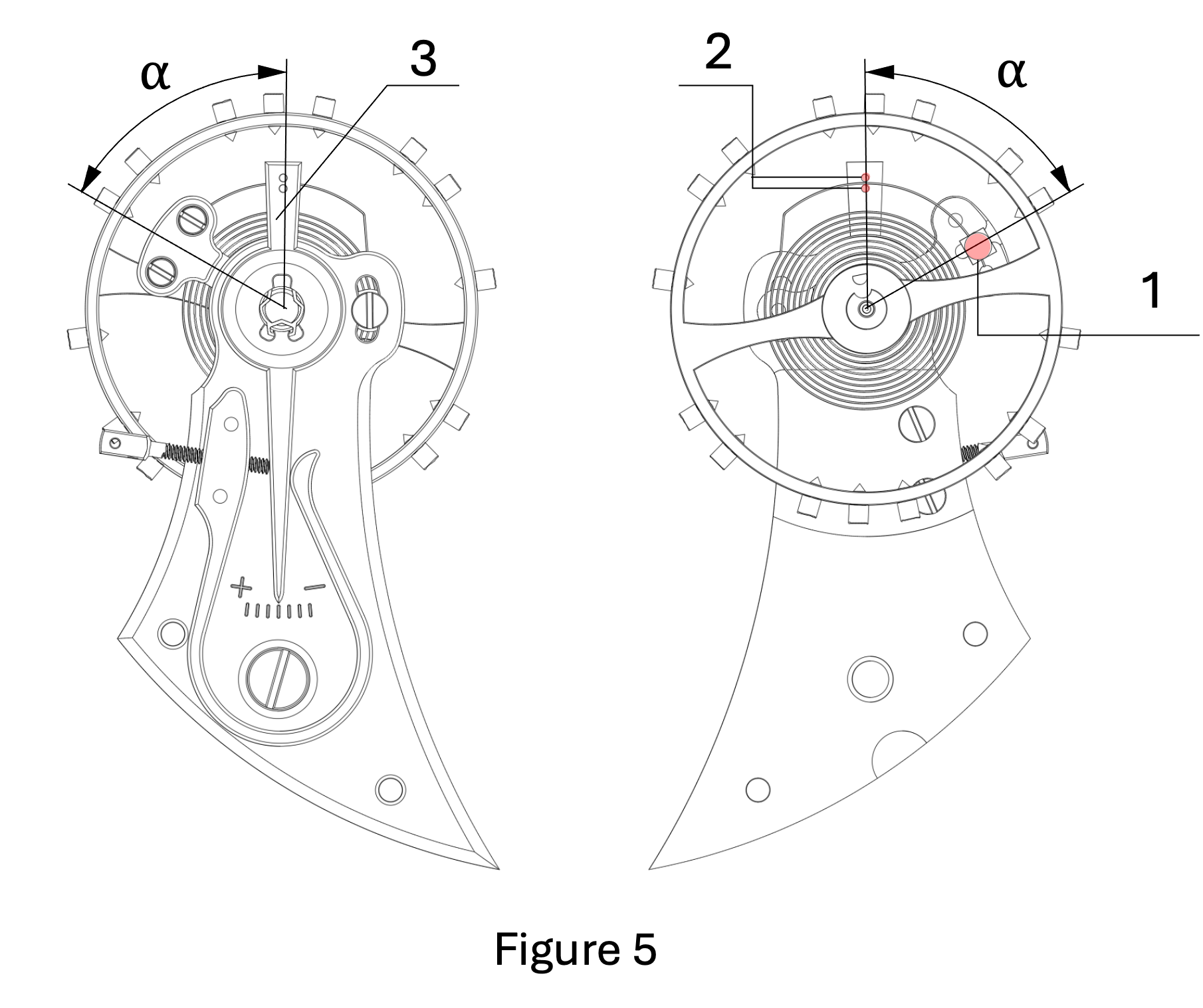 Dans un angle α généralement compris entre 60° et 70° à partir du piton (Figure 5, point 1), la courbe terminale du spiral passe entre les deux goupilles de raquette (Figure 5, point 2). Les goupilles de raquette sont chassées sur la raquette (Figure 5, point 3) qui pivote avec un léger serrage, concentriquement à l’axe du balancier.