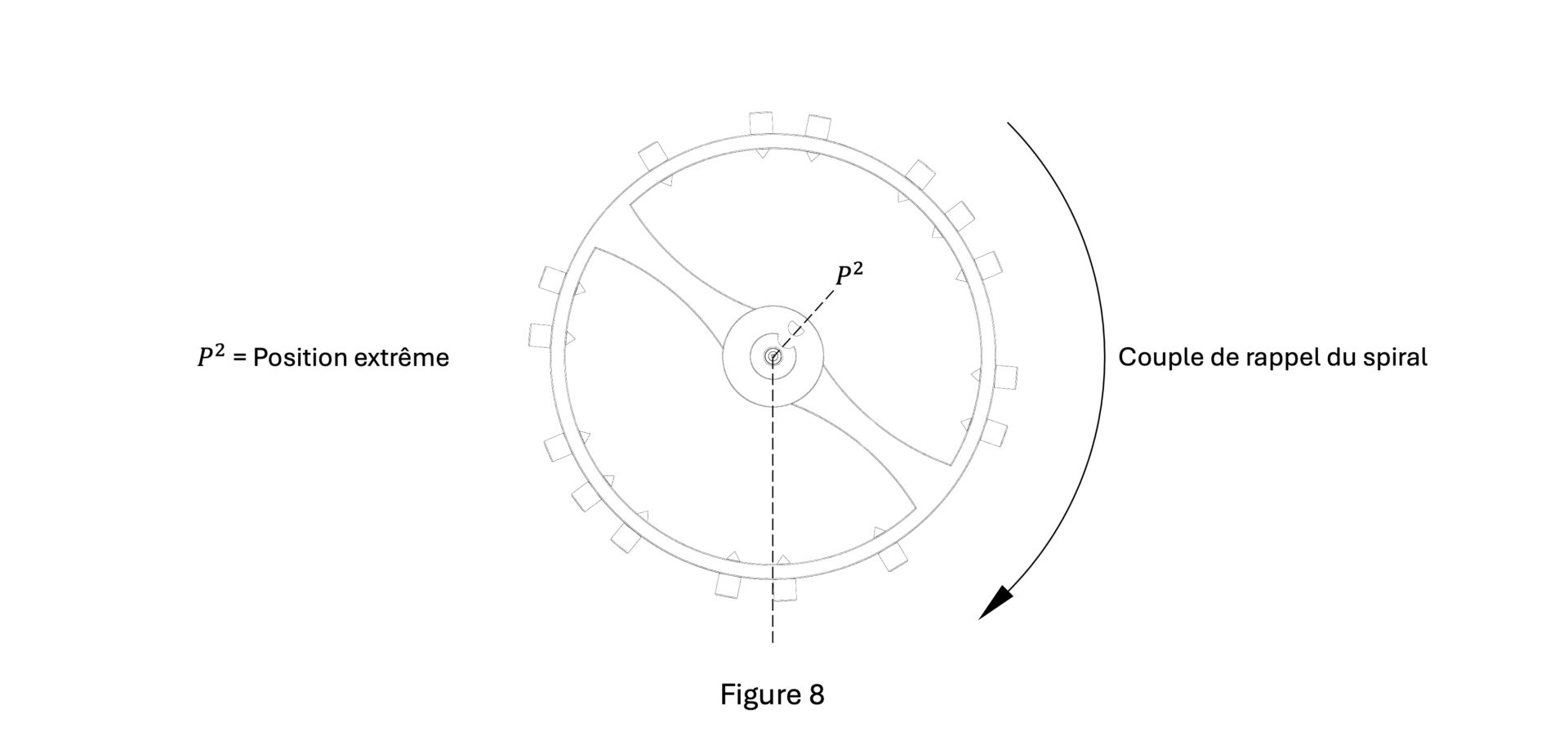 Lors du fonctionnement de la montre, le balancier-spiral oscille concentriquement à son axe de part et d’autre de sa position d’équilibre également appelée « point mort » (Figure 7). Lorsque le balancier est poussé au delà de sa position d’équilibre (lors d’une impulsion ; voir organe de distribution) on arme alors le spiral. Lorsque l’impulsion se donne dans un sens, on arme le ressort en extension (Figure 6), et lorsque l’impulsion se donne dans l’autre sens on arme le ressort en contraction (Figure 8). Dans les deux cas, on crée un couple de rappel (moment élastique) qui ramène le balancier dans sa position d’équilibre (point mort) (Figures 6 à 8).