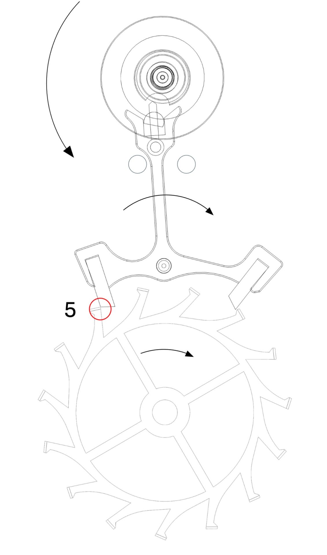 Une dent de la roue d’échappement entre en contact avec le plan de repos d’une palette de l’ancre (Figure 4).
