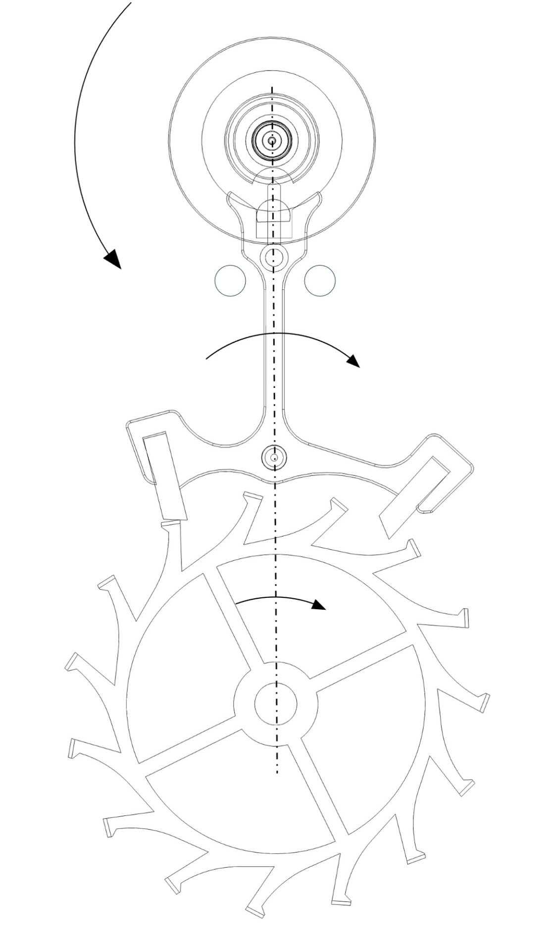 Lorsque le balancier parcoure son arc supplémentaire, le dard s’appuie contre le pourtour du petit plateau empêchant l’ancre de basculer contre l’autre goupille de limitation et donc le renversement (Figure 2).