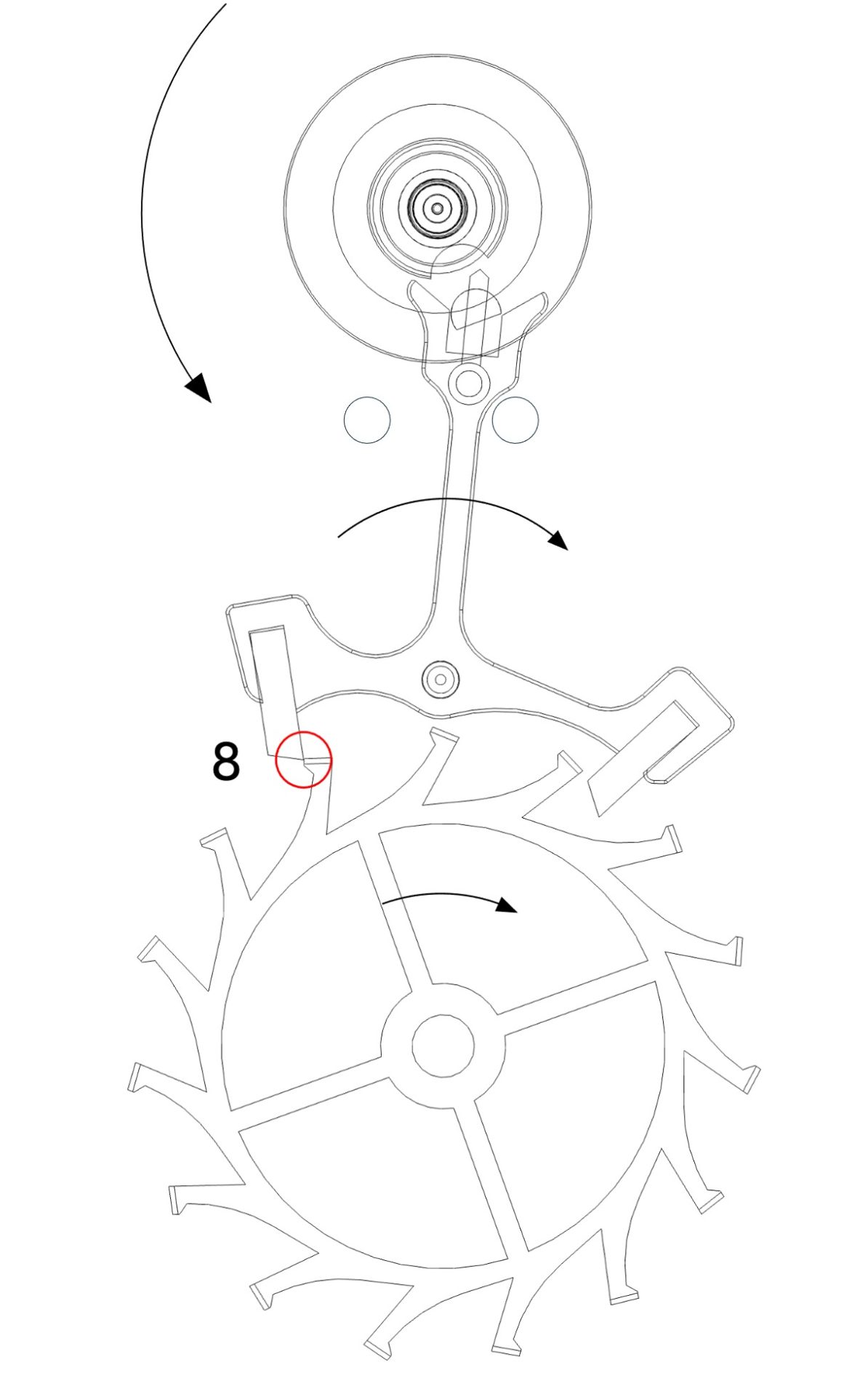 La phase d’impulsion de la roue d’échappement correspond à l’angle qu’elle parcoure durant l’action du plan d’impulsion de sa dent sur le plan d’impulsion de la palette. L’impulsion commence lorsque le bec de repos de la palette entre en contact du plan d’impulsion de la palette (Figure 5, point 7) et se termine lorsque le bec d’impulsion de la dent atteint le bec d’impulsion de la palette (Figure 8, point 8).