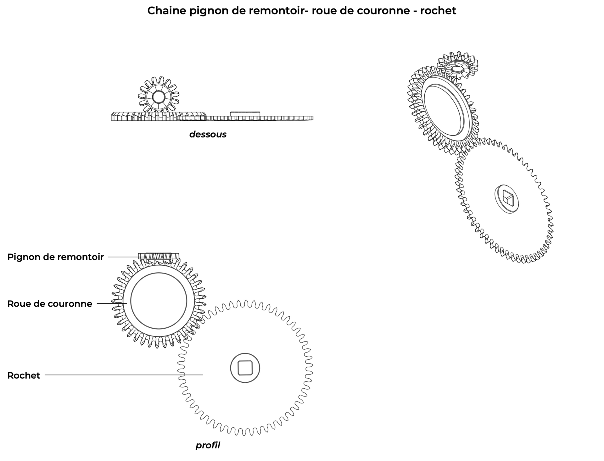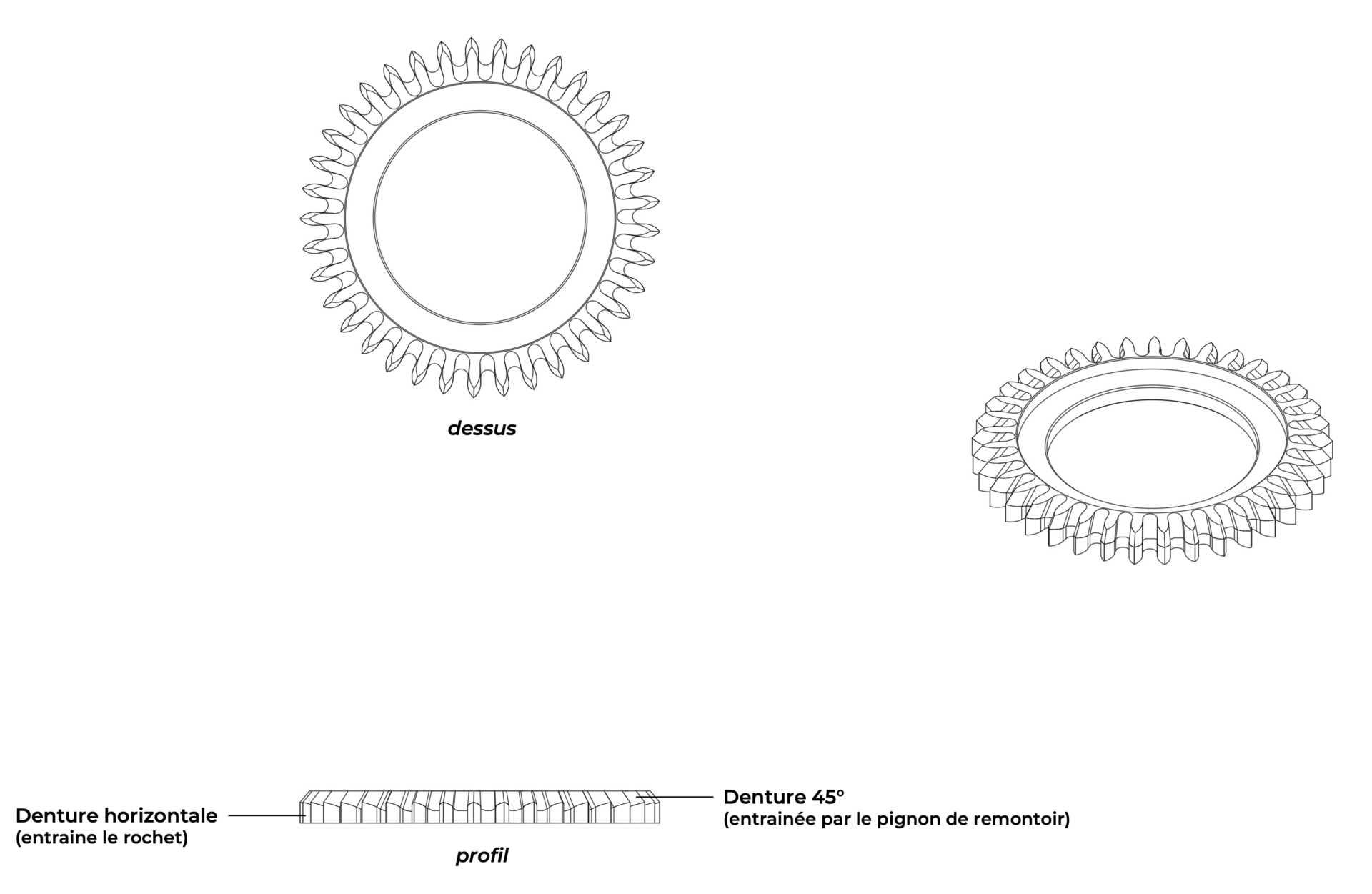 En plus de transmettre l’énergie au rochet la roue de couronne modifie le plan de l’engrenage. En effet l’axe du pignon de remontoir le positionne sur un plan vertical alors que la roue de couronne et le rochet évoluent sur un plan horizontal. Une double denture est donc taillée en périphérie de la roue de couronne : L’une d’elle, taillée avec un angle de 45° (dessous la roue de couronne) engrènera avec le pignon de remontoir, la seconde, sur le plan horizontal (en périphérie de la roue de couronne) engrènera avec le rochet. C’est cette double denture « en couronne » qui lui vaut certainement son nom. Par les couples présents dans ce train d’engrenages, tous ses composants sont en acier. C’est le cas de la roue de couronne qui pivote sur un noyau d’aussi grand diamètre que possible. L’axe de rotation de la roue de couronne absorbe ainsi mieux les forces présentes et garanti un niveau de friction aussi faible durablement que possible.