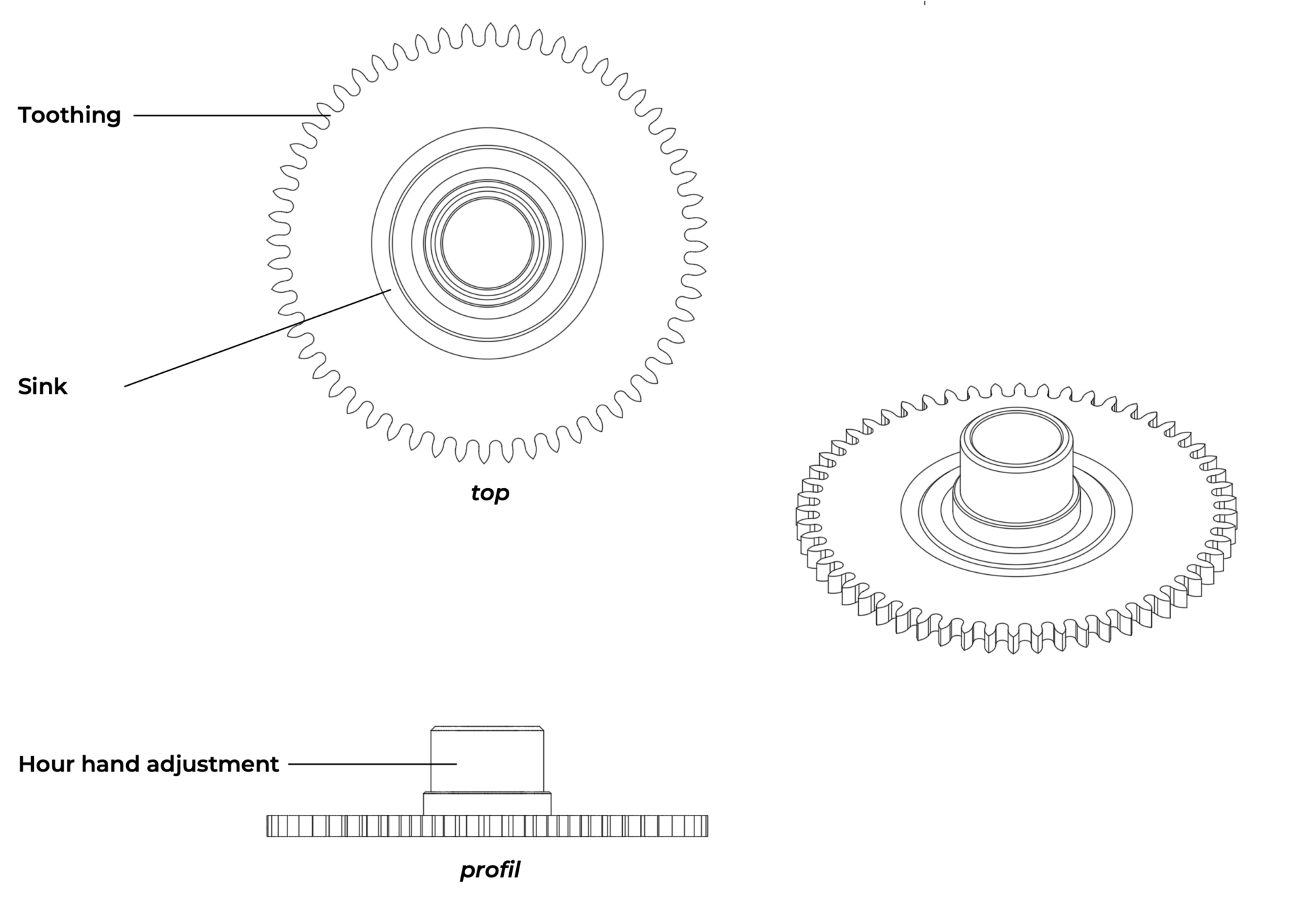 Technically, the hour wheel is a simple piece. As a base, it has a thin, large-diameter wheel plate, on the periphery of which the teeth are cut. In the centre of this base rises a tall tube (the cannon pinion, also referred to as the hour wheel). At the top of the hour wheel’s cannon, there is a bearing to accommodate the hour hand.