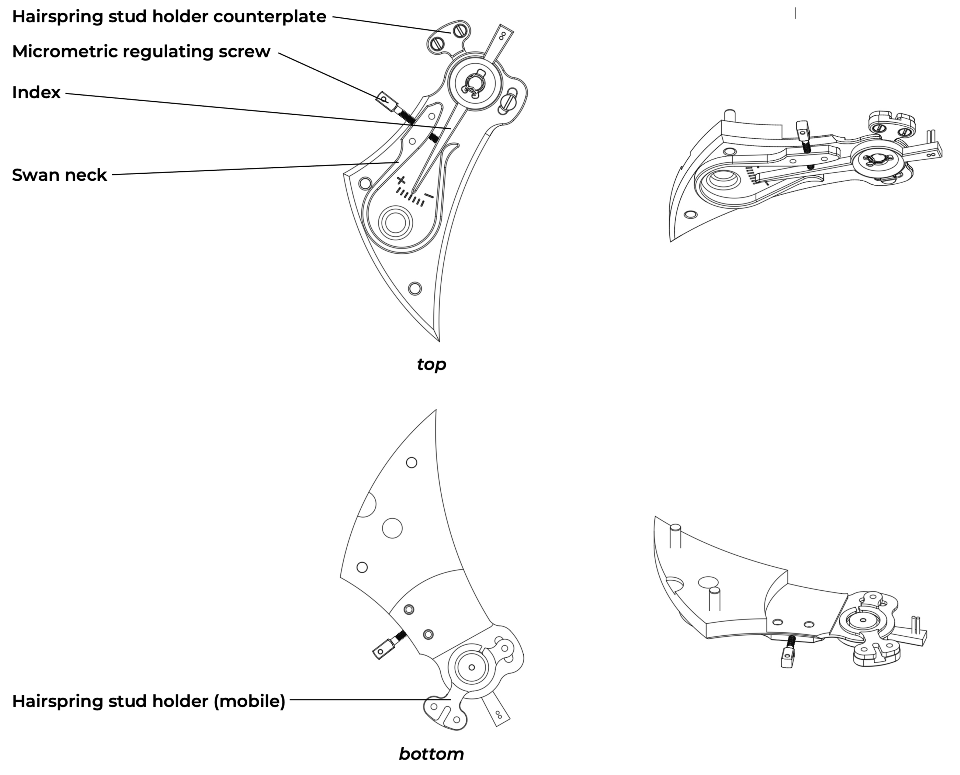 The index-assembly gathers all the peripheral components to the regulating organ (balance-spring) and allows for the correction of its adjustment. Depending on the construction and chosen adjustment method, the number of its components may vary. For instance, you generally won’t find an index-assembly in a movement with a terminal curve hairspring (such as Breguet or Philips).