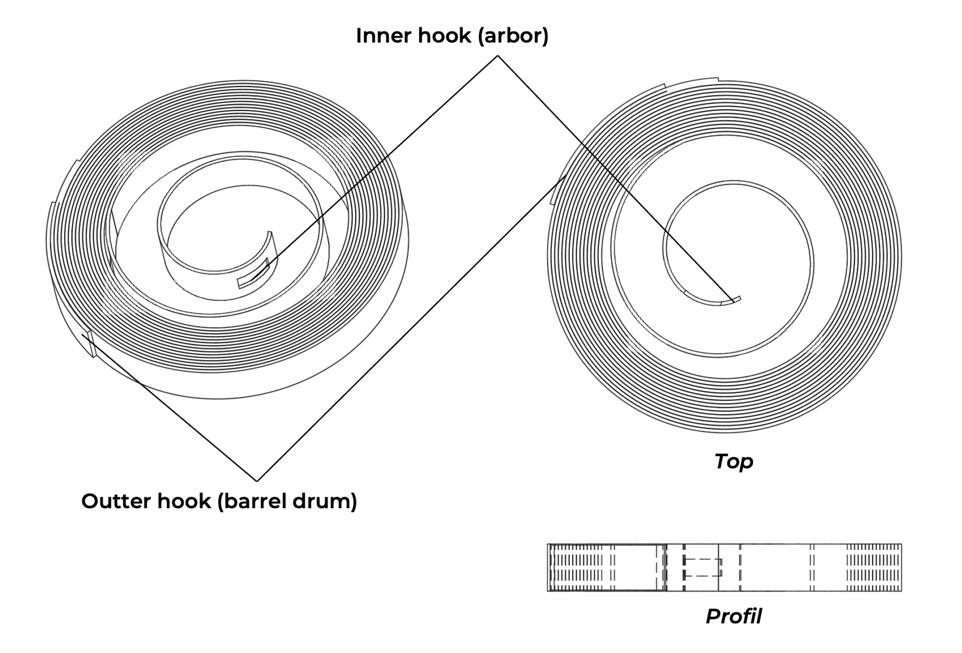 The inner end of the mainspring features a rectangular opening that allows it to be secured to the hook on the barrel arbor. At the outer end of the blade, a short section of spring with an inverted curvature is welded to the final coil. This welded section is called the clamp. It allows the outer end of the mainspring to be anchored into the recess machined into the inner wall of the barrel drum.