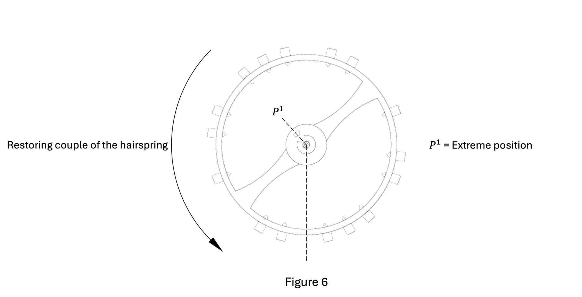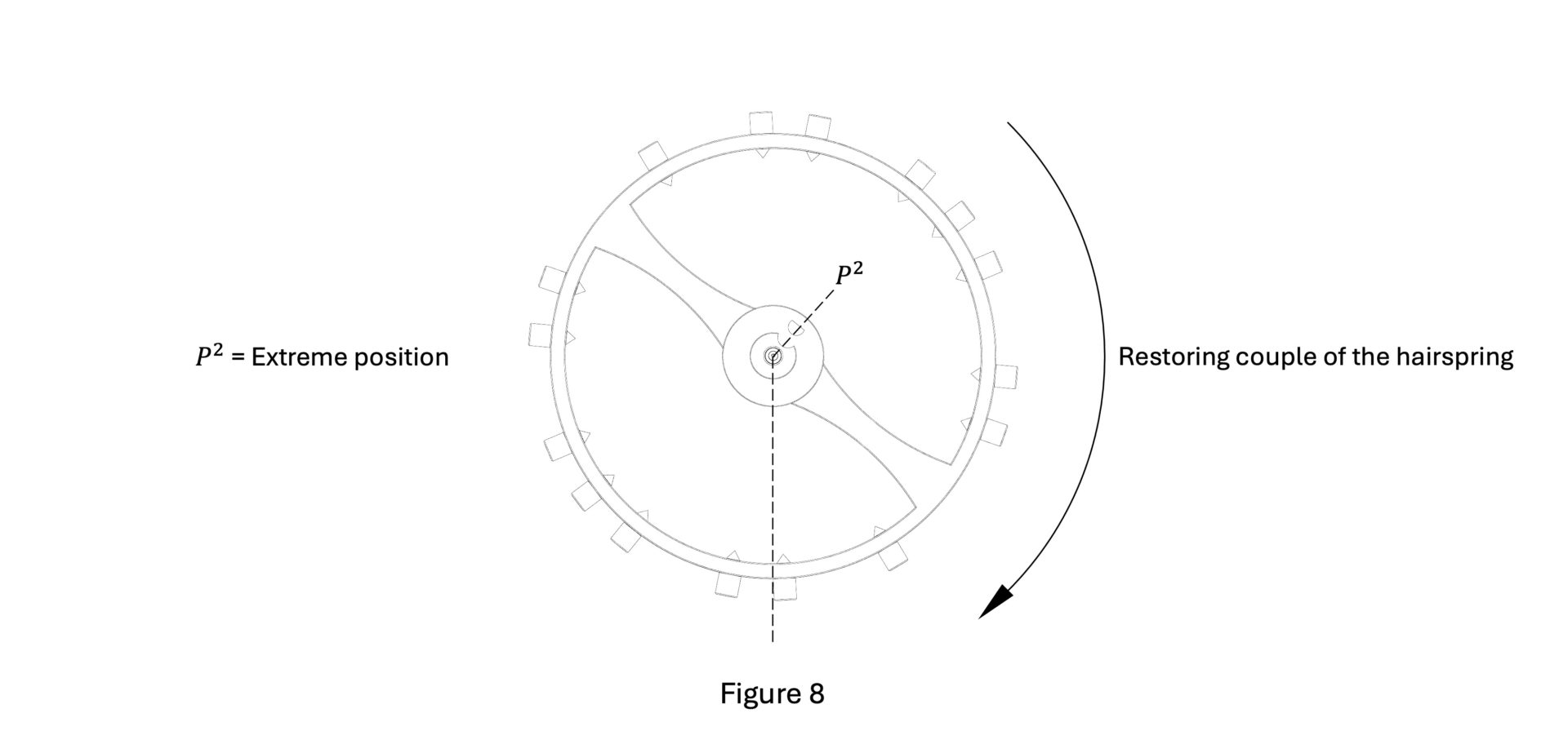 When the impulse is delivered in one direction, the spring is tensioned in extension (Figure 6), and when the impulse is delivered in the other direction, the spring is tensioned in contraction (Figure 8). In both cases, a restoring torque (elastic torque) is created that brings the balance wheel back to its equilibrium position (dead point) (Figures 6 to 8).