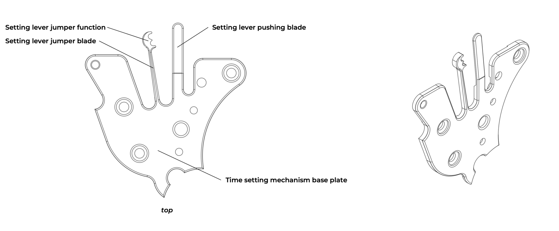The setting lever jumper is part of the winding and time-setting mechanisms. It defines the two positions (winding and time-setting) of the setting and, consequently, establishes the two same positions of the setting lever mechanism and its travel. In many cases, the setting lever jumper is cut from the base plate (bridge) of the winding mechanism.