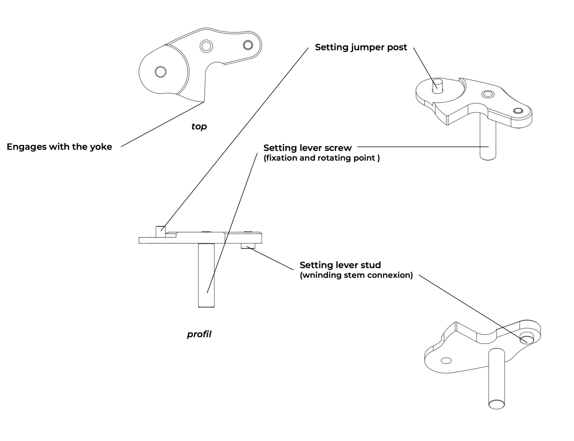 A setting lever is commonly associated with both the winding and time-setting mechanisms. It is a lever activated by the winding stem switches and holds the yoke in its two positions (winding and time-setting). Additionally, the setting lever secures the stem to the movement.