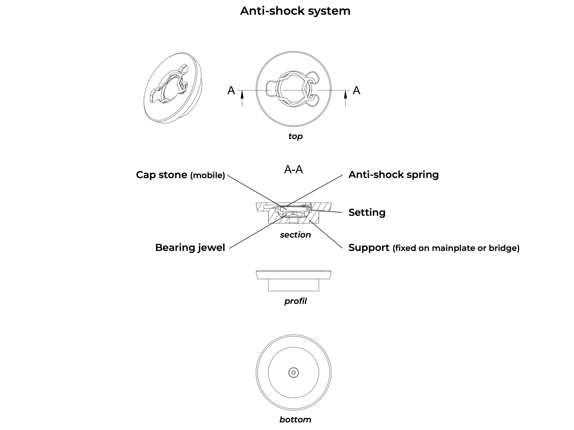 Shock absorbers are amortising devices placed at pivot points in the movement to minimize the risk of pivot breakage during an impact. Shock absorbers are primarily used for the balance wheel bearings. This is because the balance wheel has a high inertia (weight) and pivot diameters that are often less than 0.15mm.