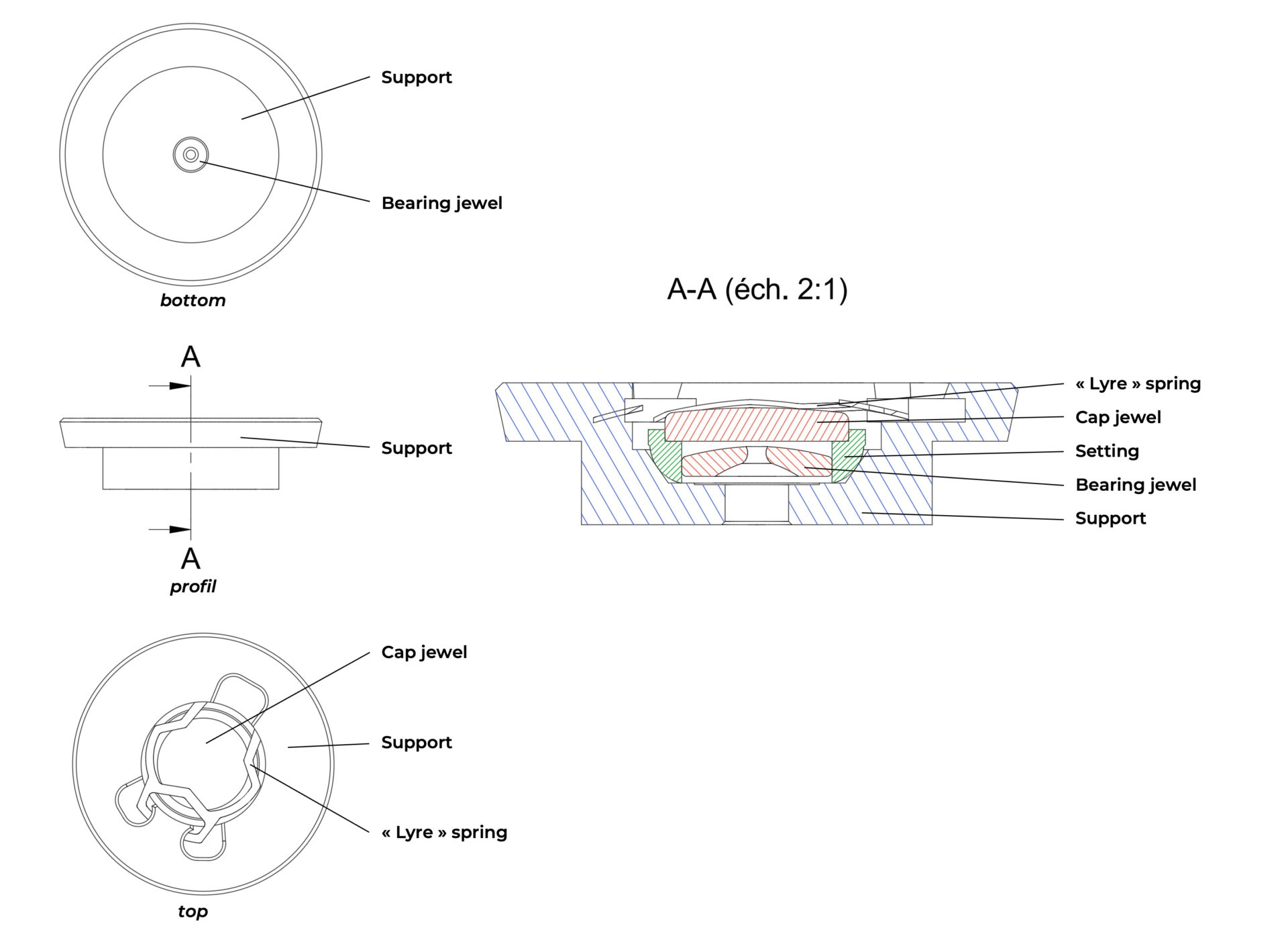 The bearing jewel is securely fitted into the lower section of the setting and pierced to allow the passage of the pivot. The cap jewel, which is flat and unpierced, rests freely in the upper, removable part of the setting. Its diameter is slightly smaller than its housing (Figure 1), allowing it to move vertically along the pivot axis (Figure 2) and tilt slightly in any direction (Figure 3) during an impact.
