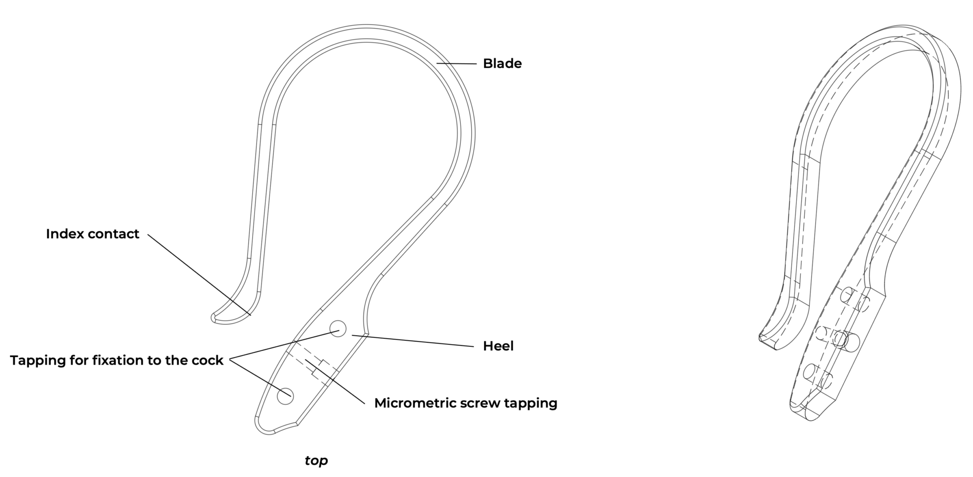 For mass production, investing in a stamping tool is justified to manufacture swan necks at an optimal cost. The enlarged contour of the profile is punched directly into a strip of steel slightly thicker than the finished component using a stamping press. However, manual steps are still unavoidable. Subsequently, the feet that will facilitate its positioning on the balance cock need to be added. The spring must then be brought to its final dimensions (profile and thickness) while providing the desired finishing and decorations (satin-finish, angling, etc.).