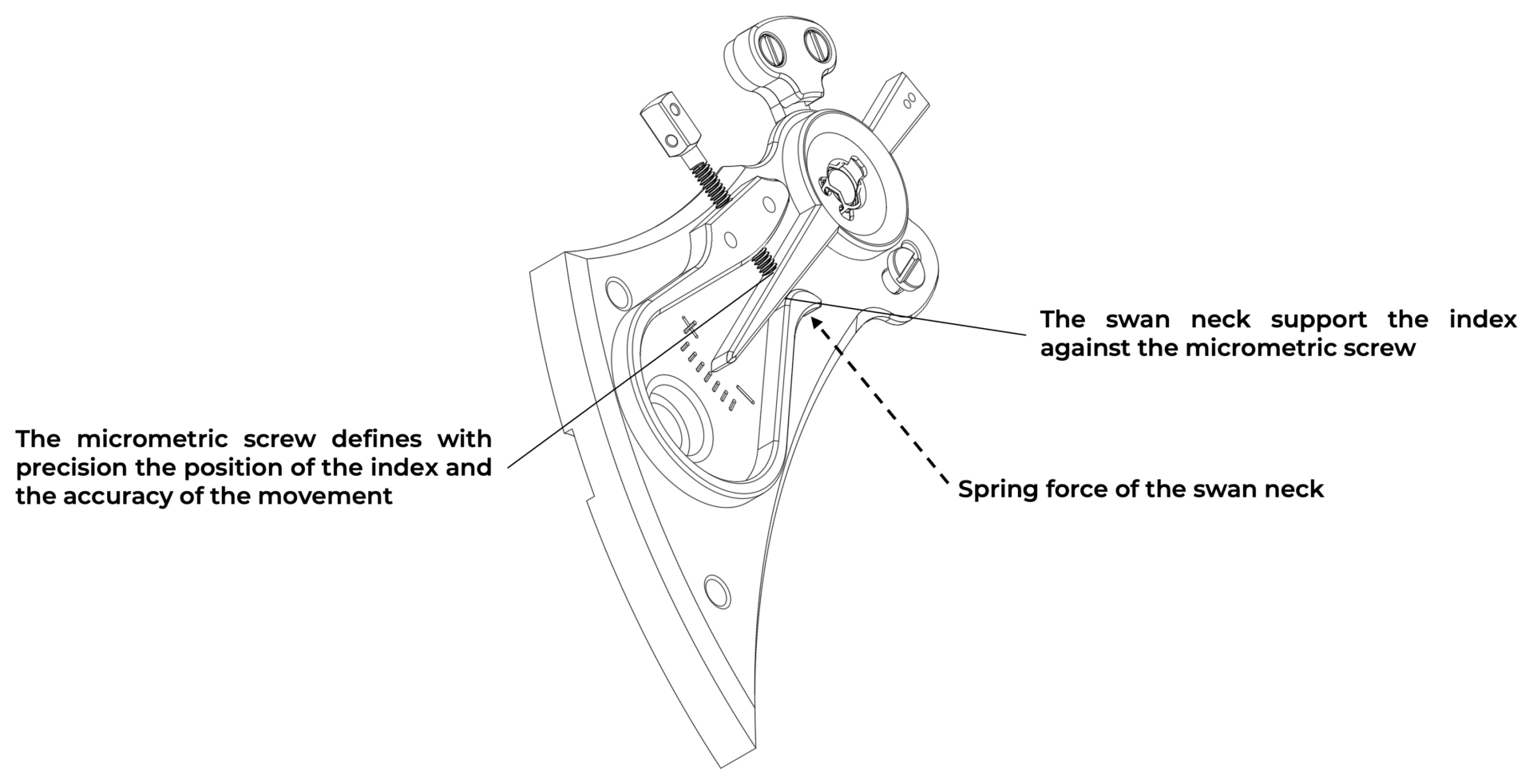 A swan neck is an elegant steel spring exclusively reserved for watches equipped with a flat hairspring and a certain level of craftsmanship. Its name is derived from its distinctive shape. The swan neck screws onto the upper surface of the balance bridge, and “embraces” the tail of the index. Technically, the swan neck serves a dual purpose. It presses the index against the buffet formed by the micrometric screw associated with the swan neck, ensuring that the adjustment established by the watchmaker remains the same and is not likely to be altered by an impact or a shock. The combination of the swan neck and its micrometric screw allows for a much finer adjustment than a traditional system lacking the swan neck-micrometric screw tandem.