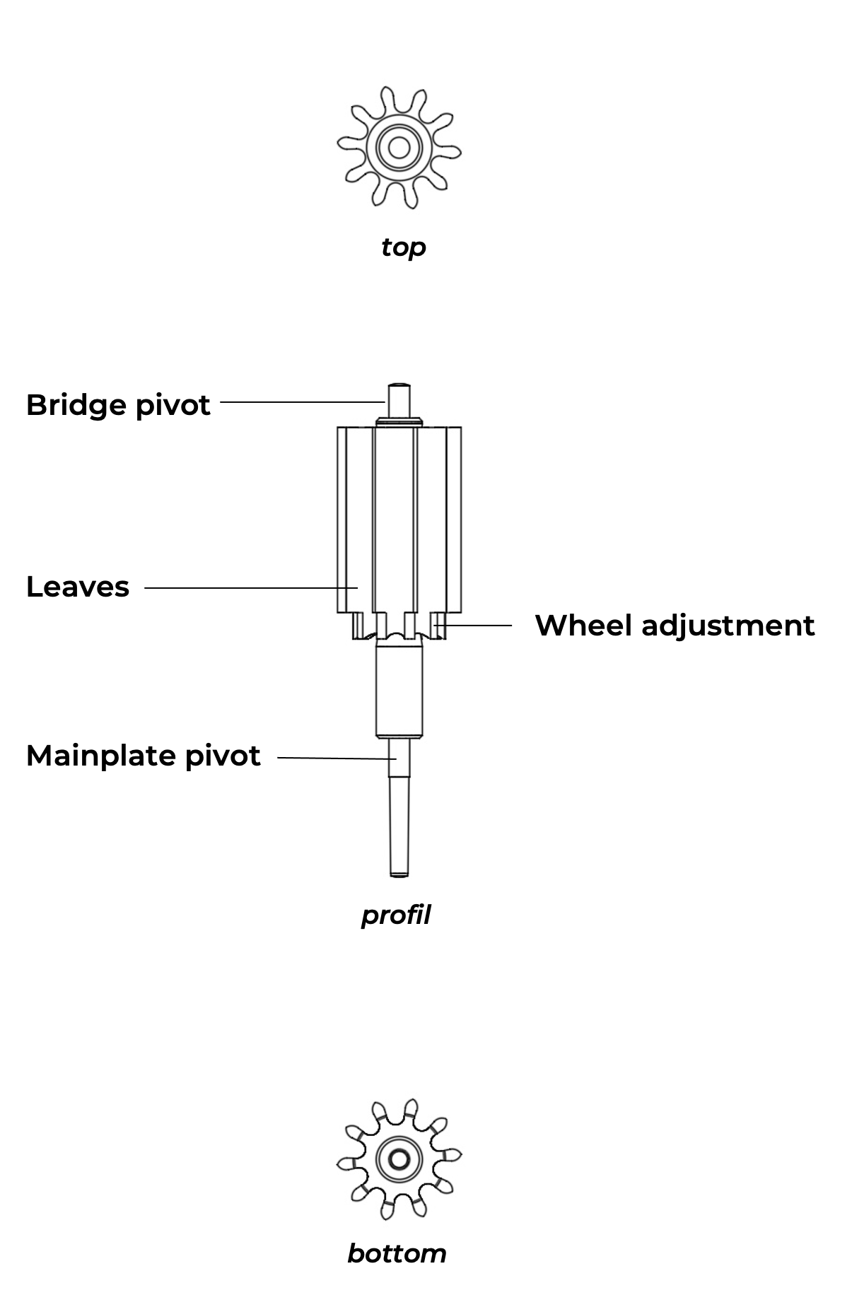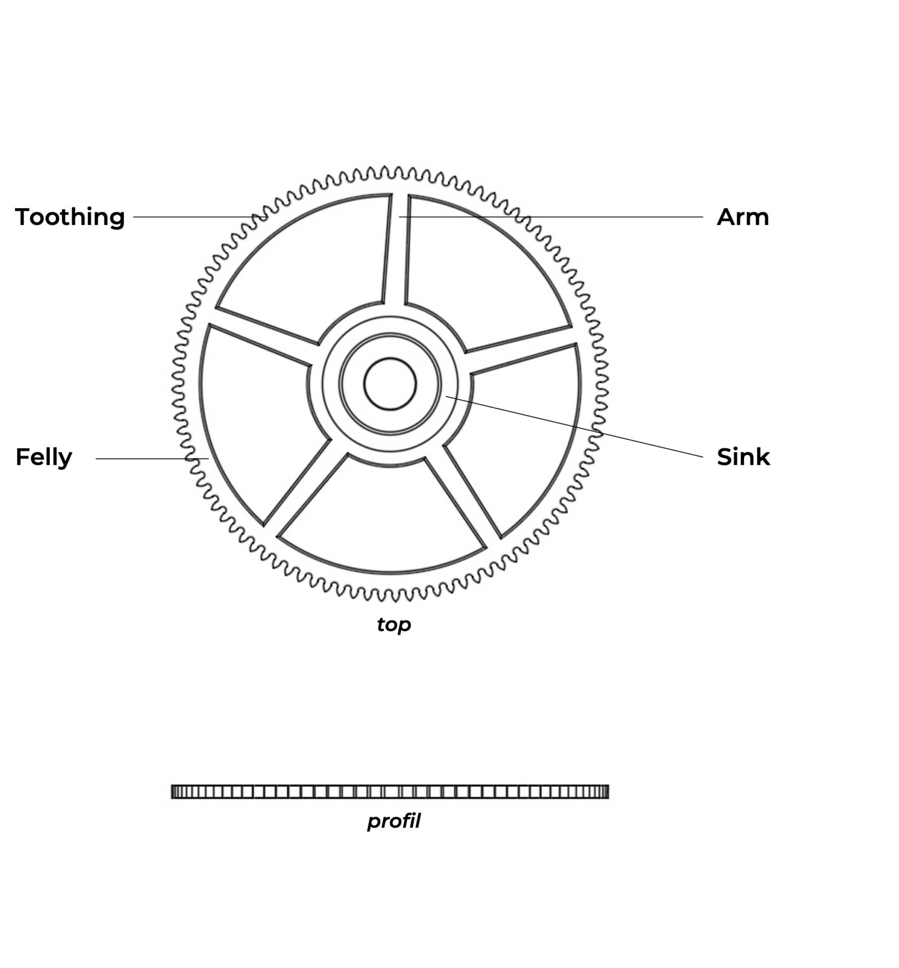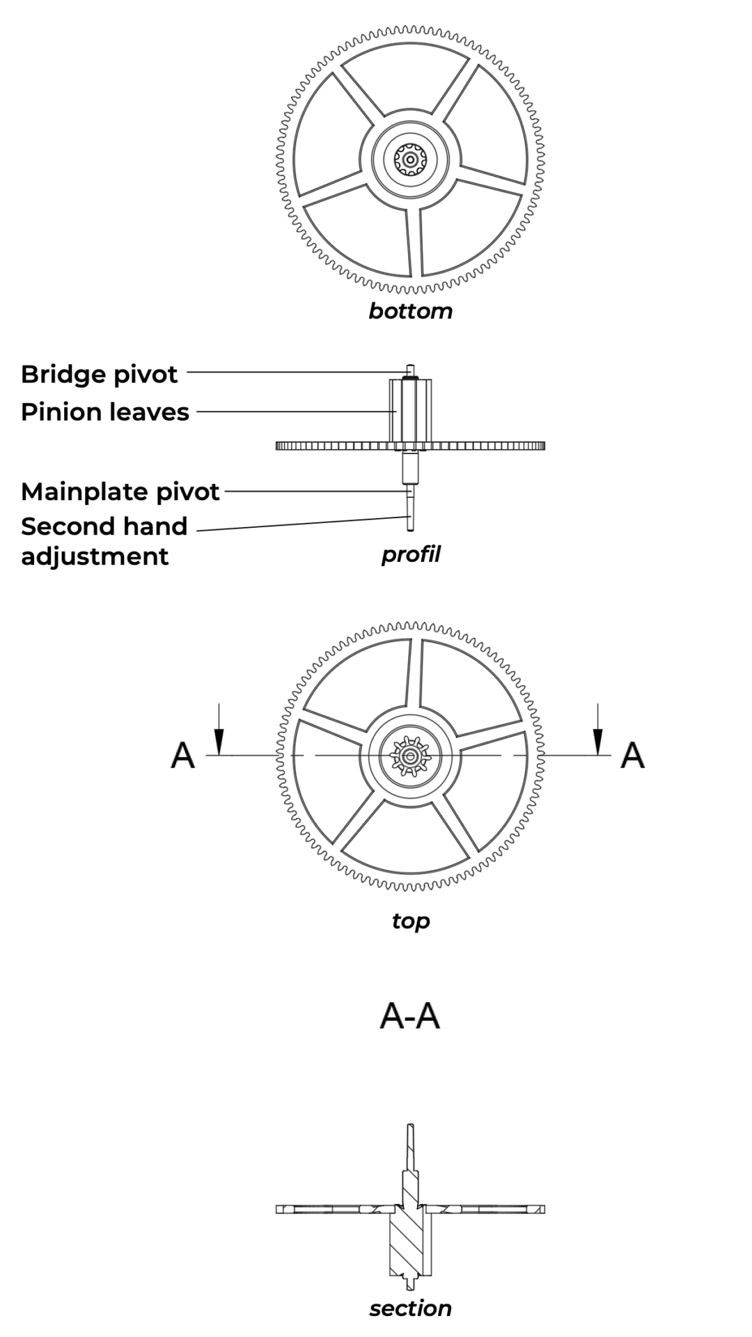 The third wheel is a component of the counting and transmission organ, responsible for dividing time into elementary units and, depending on the construction, enabling the display of the seconds. Driven by the second wheel, it transmits the energy it receives to the escape pinion.