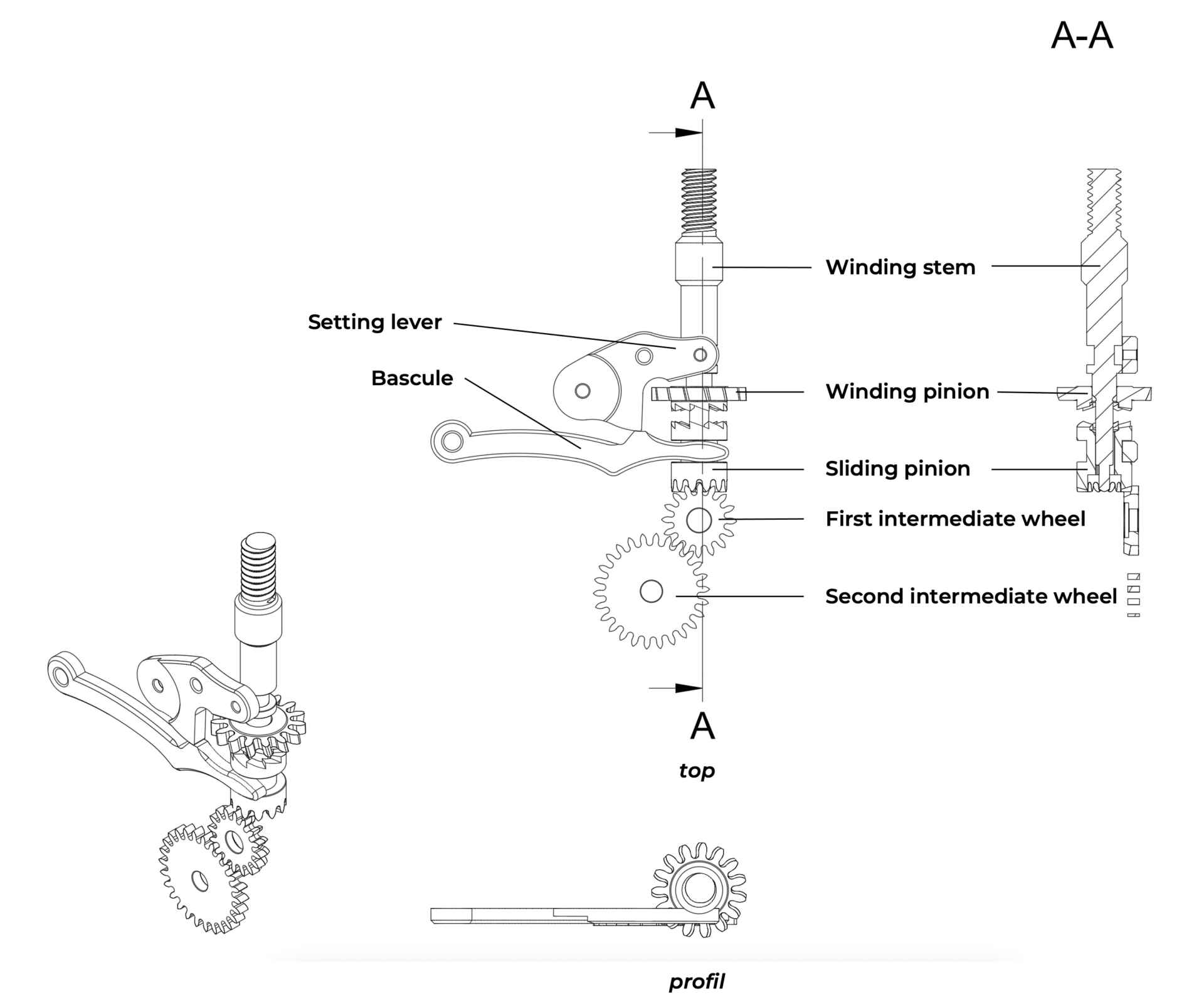 A time-setitng mechanism comprises all the components intended to adjust the time indicated by the watch. The number of its components may vary depending on the constructions, and many of them also belong to the winding mechanism. The components of the time-setting mechanism are: