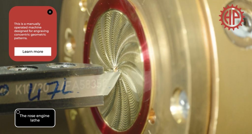 Interactive information box about the rose engine lathe integrated into the engine turning video (Horopedia, 2025)
