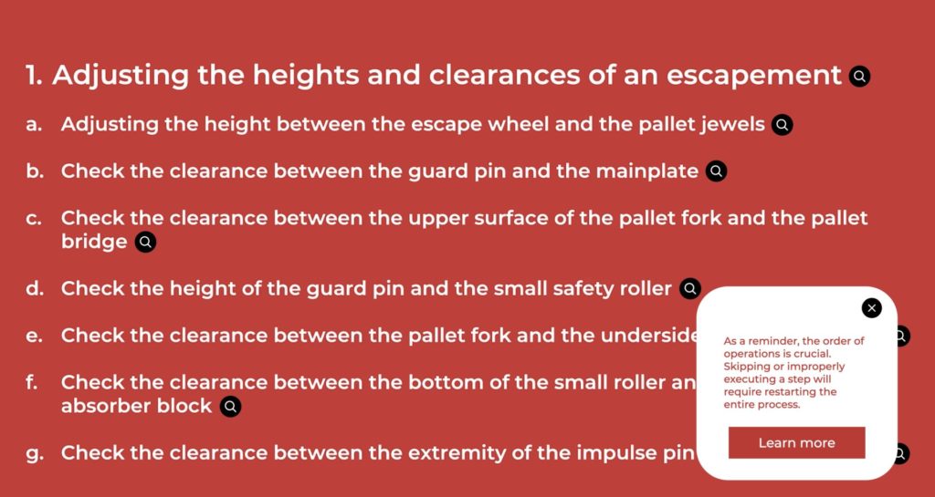 These interactive versions now allow users to access additional information directly from the video via integrated dynamic buttons. Interactive zones light up when hovered over, while red and white dots appear in the progress bar to indicate them. By clicking on these elements, users may pause the video to explore complementary content — for example, an explanatory sheet on the rose engine lathe — or return to a specific moment in the film using magnifying-glass icons to review a particular escapement adjusting operation.